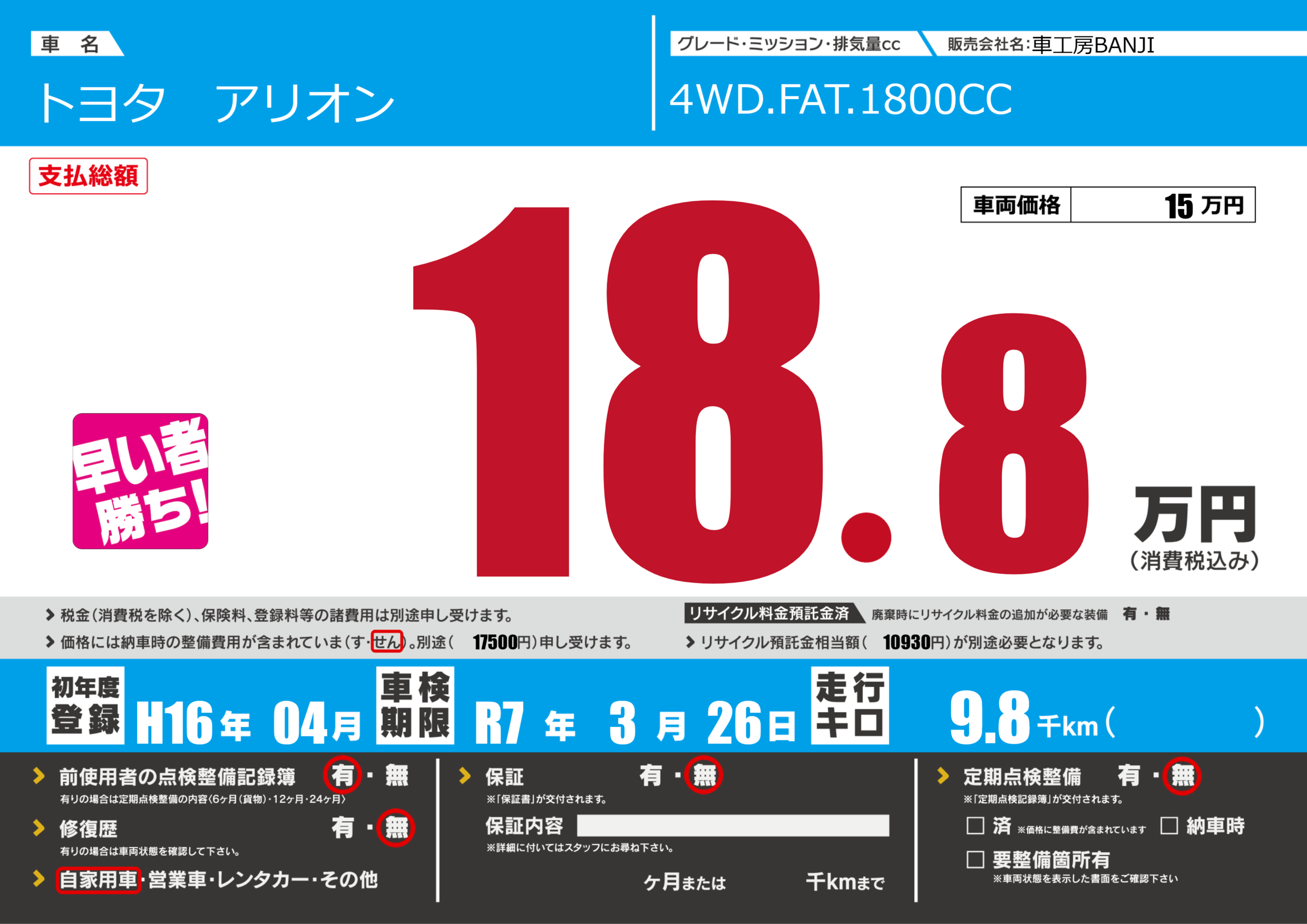 | 車名 | トヨタ アリオン | グレード ミッション 排気量 |