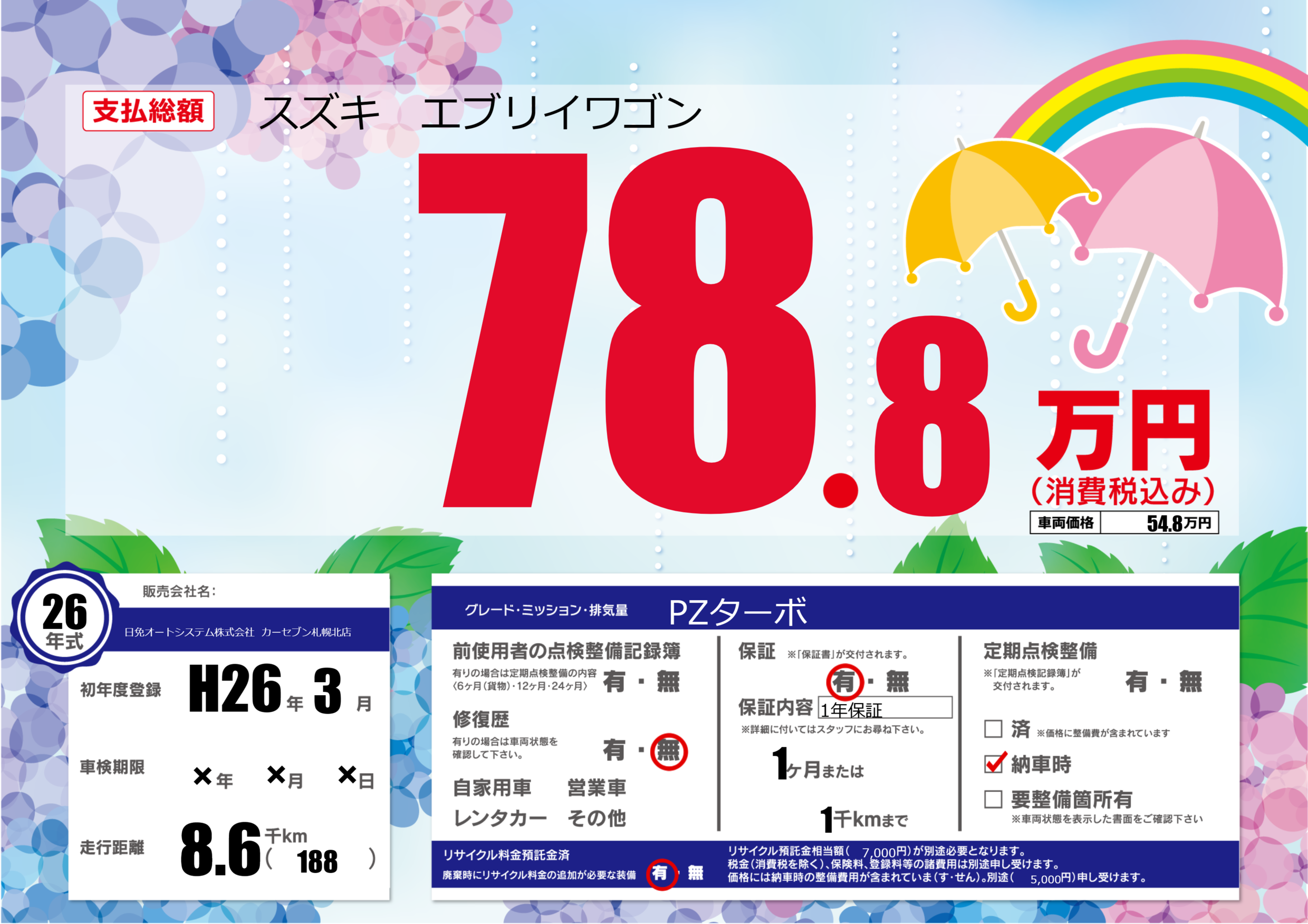 | 車名 | スズキ エブリイワゴン | グレード ミッション 排気量 |