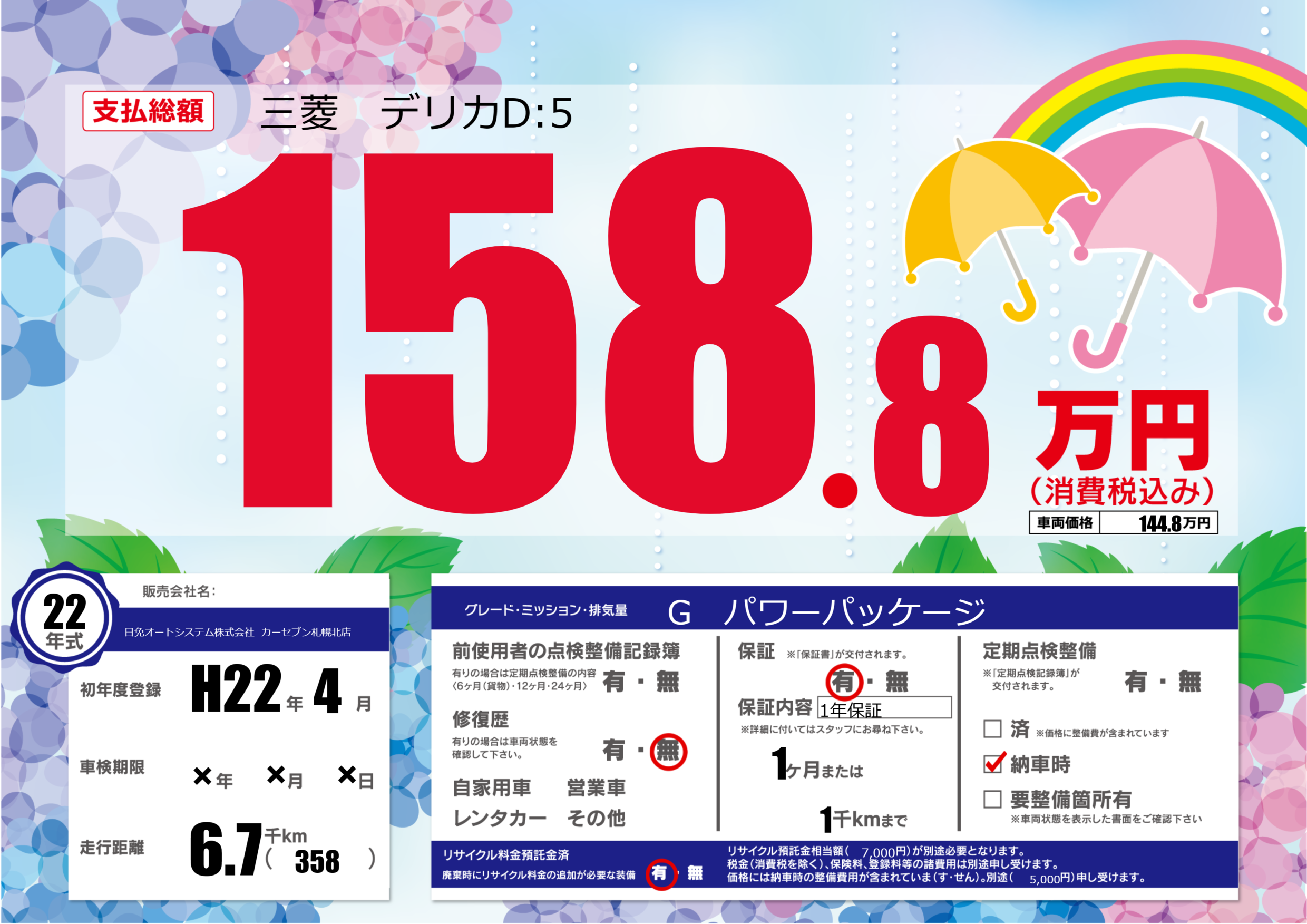 | 走行キロ | 0.6万km | 初年度登録 | H22年4月 |