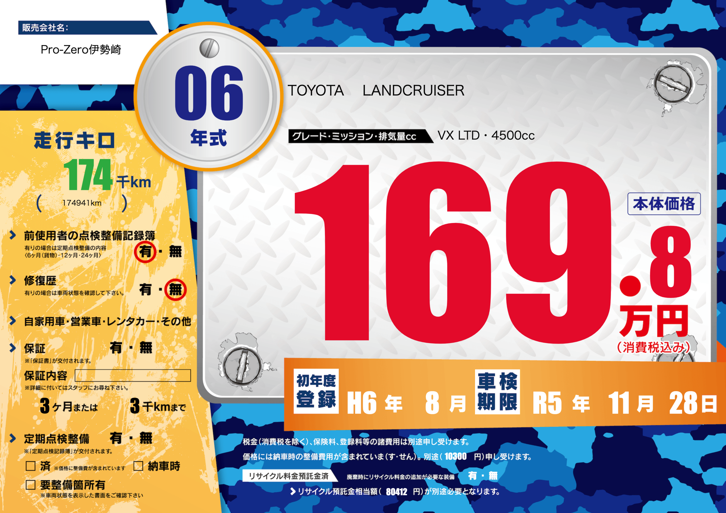 | 車名 | TOYOTA LANDCRUISER | グレード ミッション 排気量 |