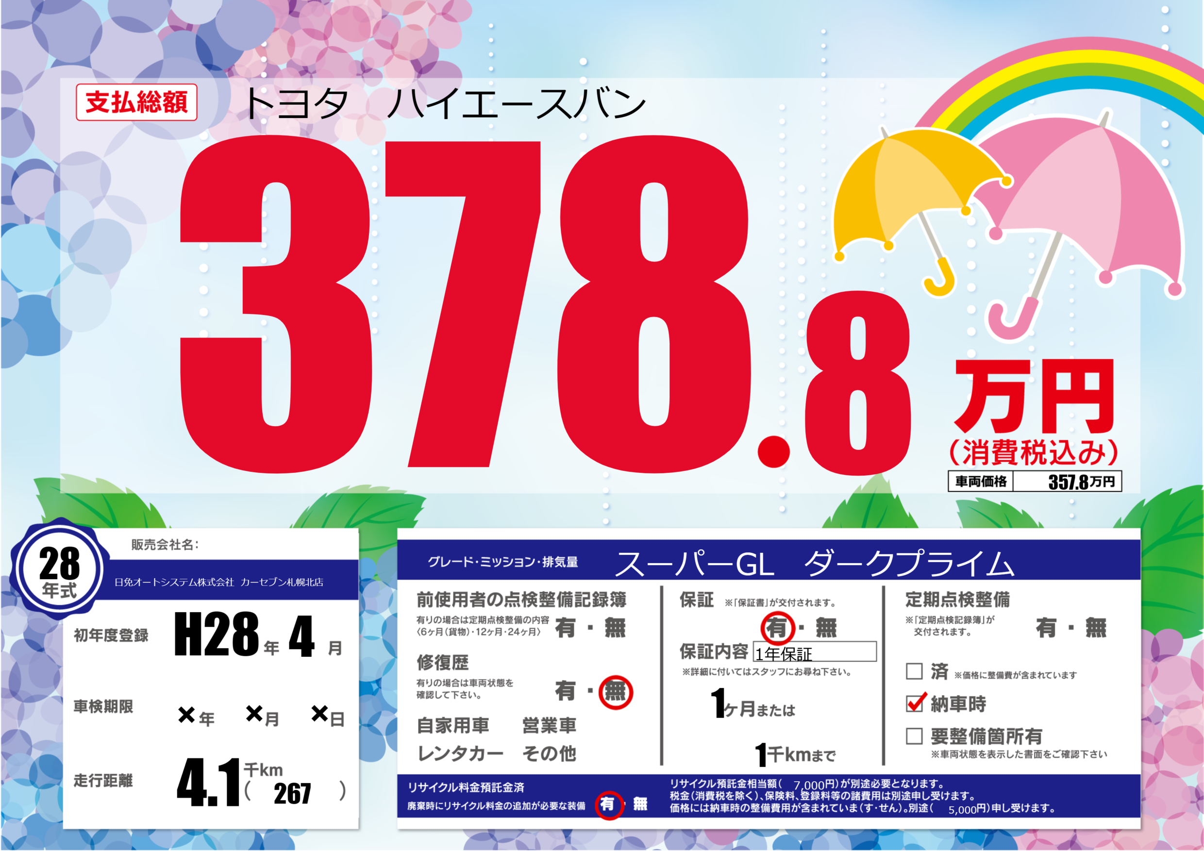 保証付き 保証内容(1年保証) 1ヶ月または(1)千kmまで |