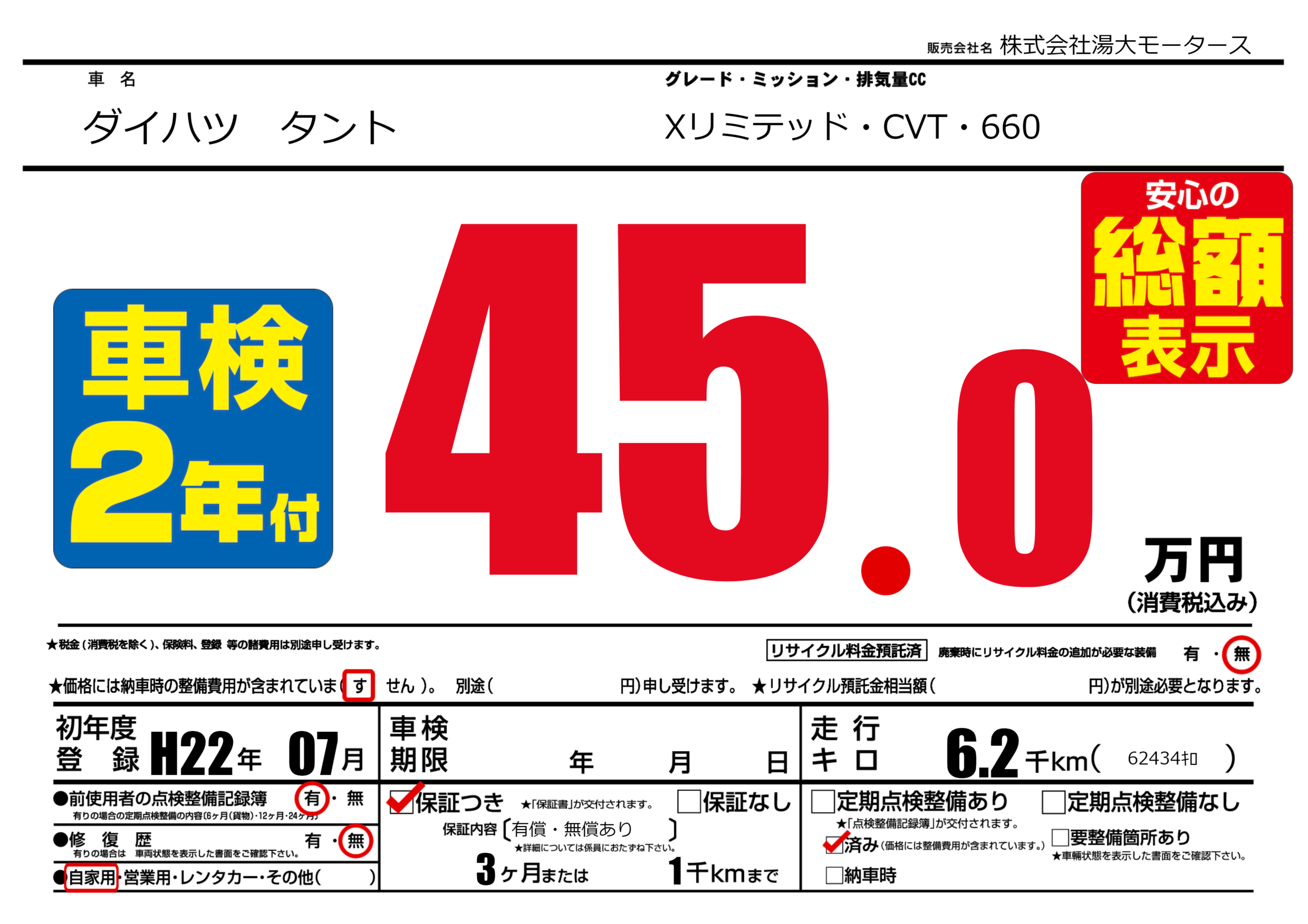 | 車名 | ダイハツ タント | グレード ミッション 排気量 |