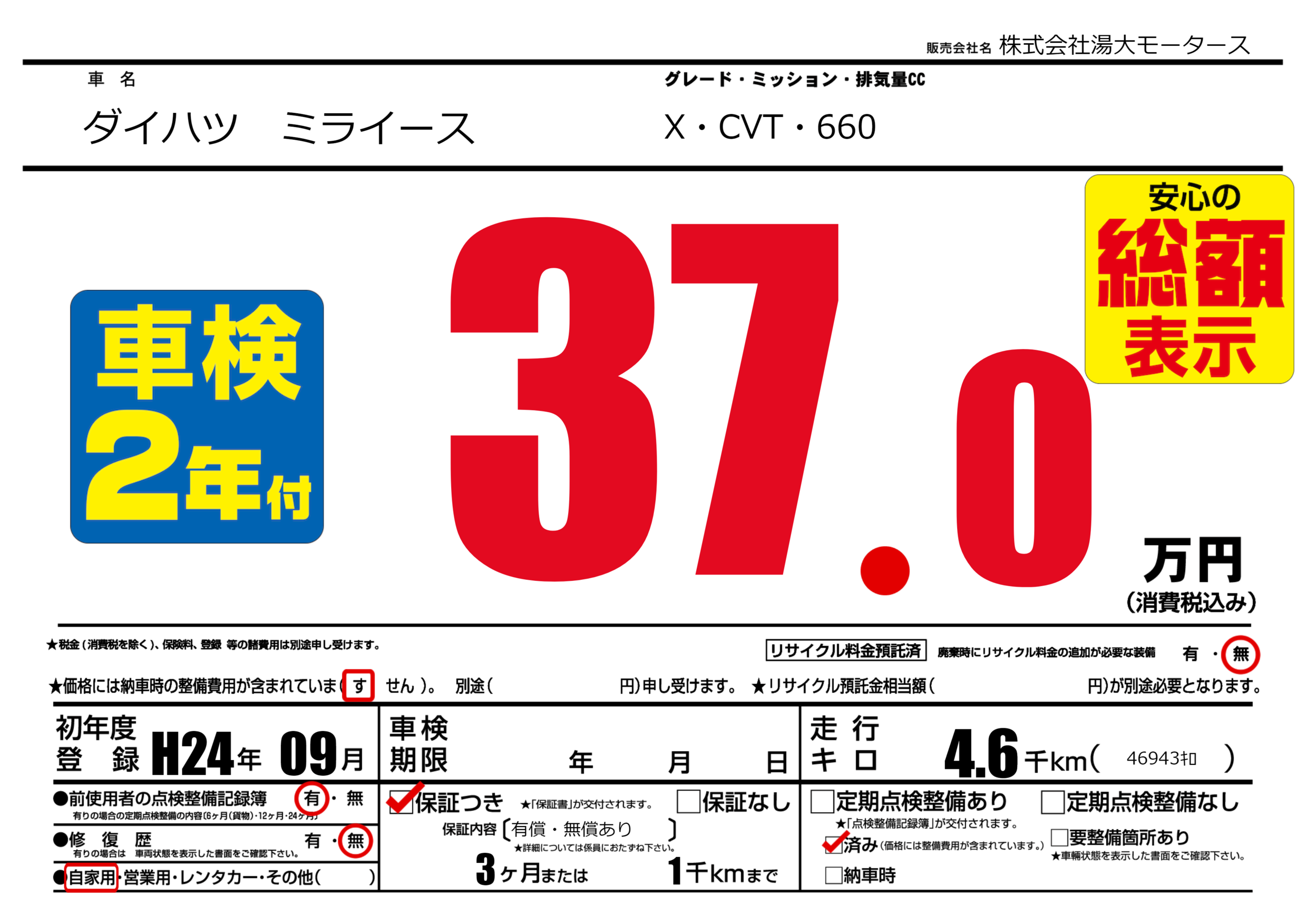 | 定期点検整備 | 定期点検整備済み | ||