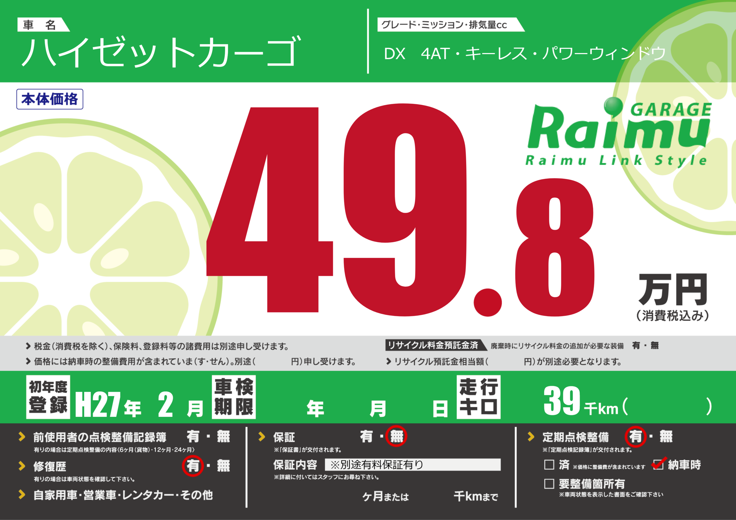 | 車名 | ハイゼットカーゴ | グレード ミッション 排気量 |