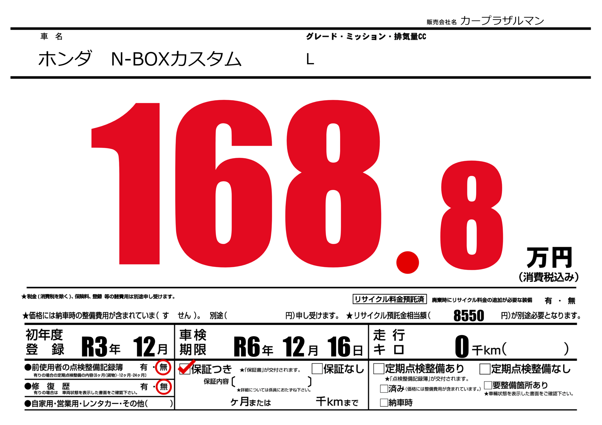 | 車名 | ホンダ N-BOXカスタム | グレード ミッション 排気量 |