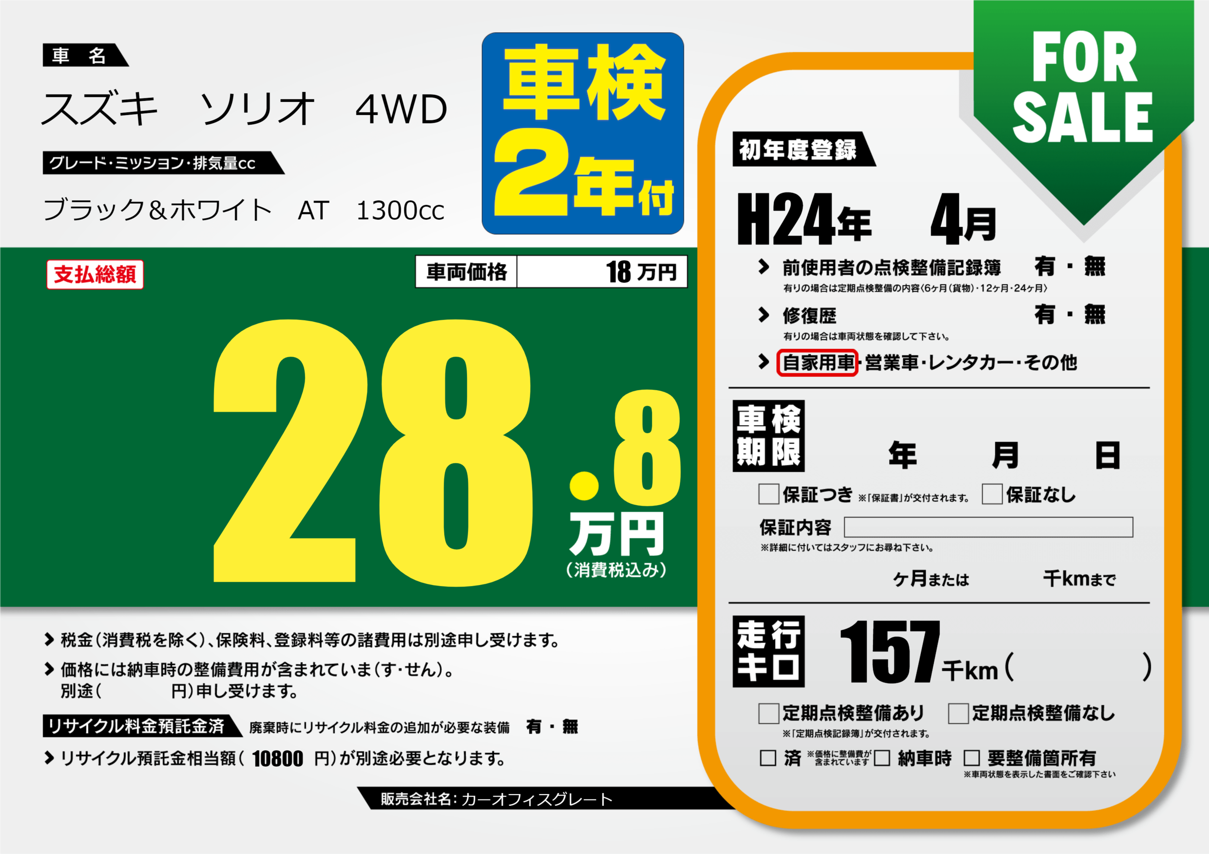 | 車名 | スズキ ソリオ 4WD | グレード ミッション 排気量 |