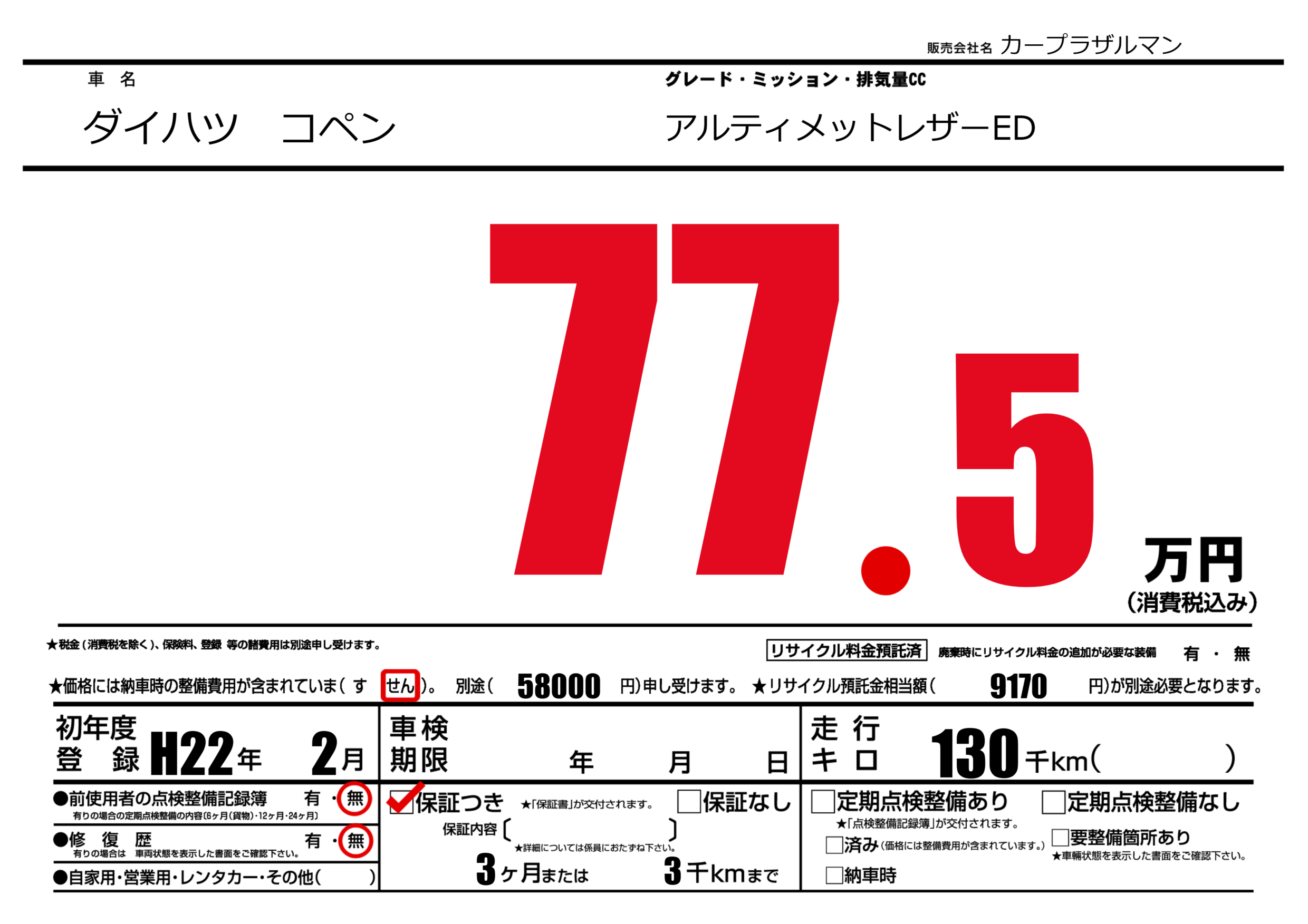 | 車名 | ダイハツ コペン | グレード ミッション 排気量 |