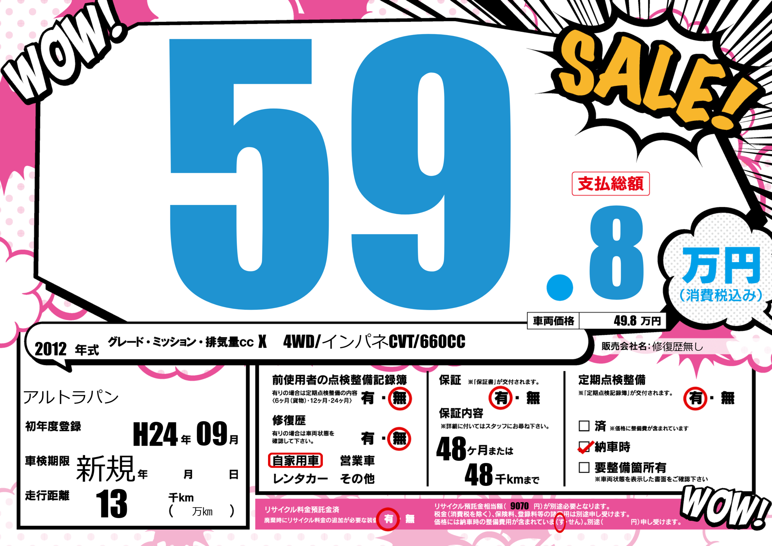 | 定期点検整備 | 定期点検整備あり 納車時あり | ||
