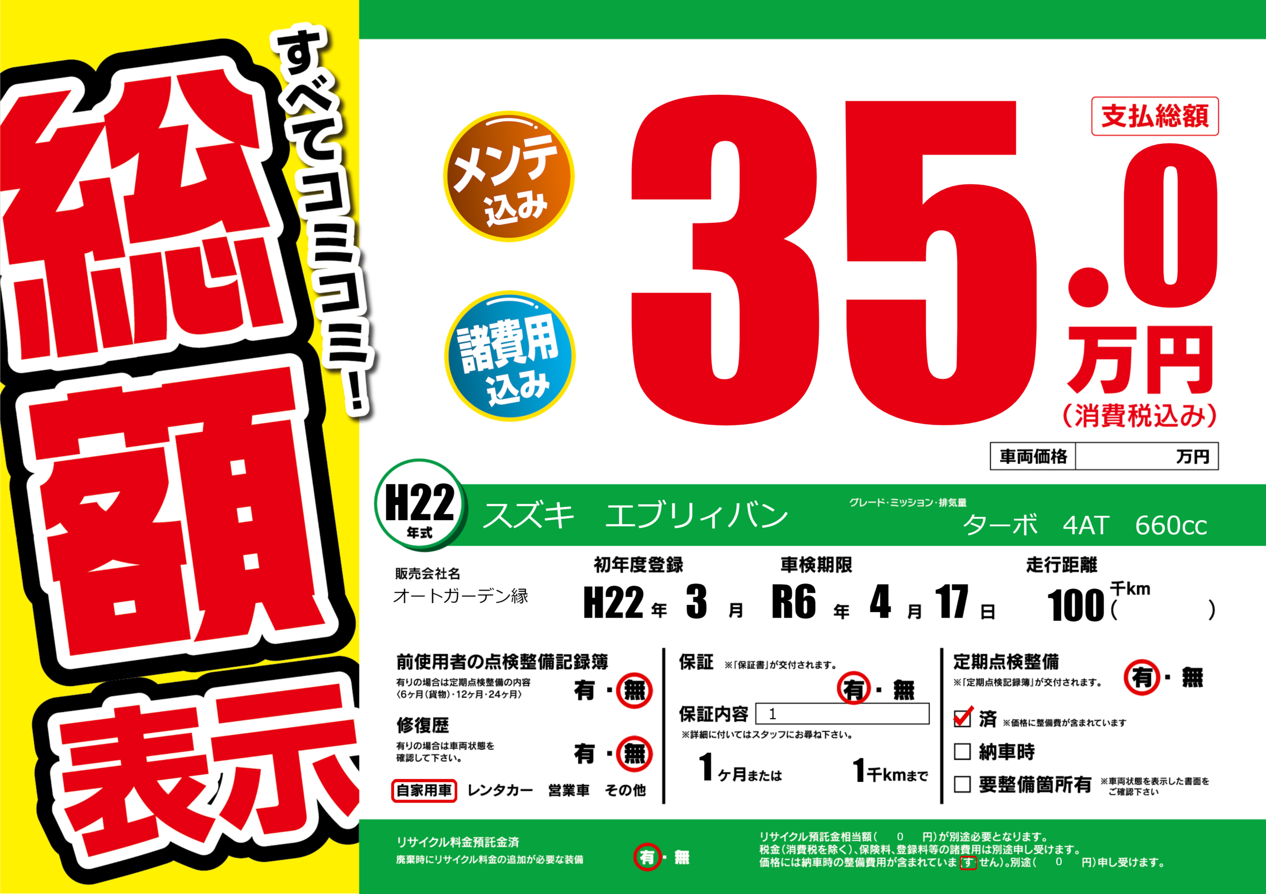 | 定期点検整備 | 定期点検整備あり 定期点検整備済み | ||
