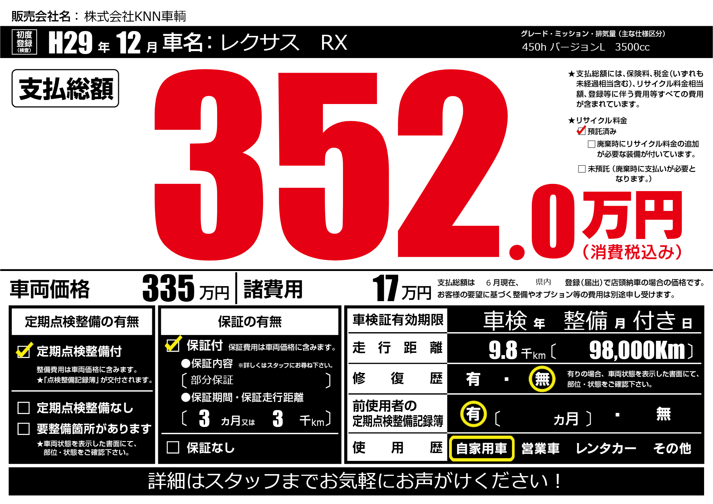 | 車名 | レクサス RX | グレード ミッション 排気量 |