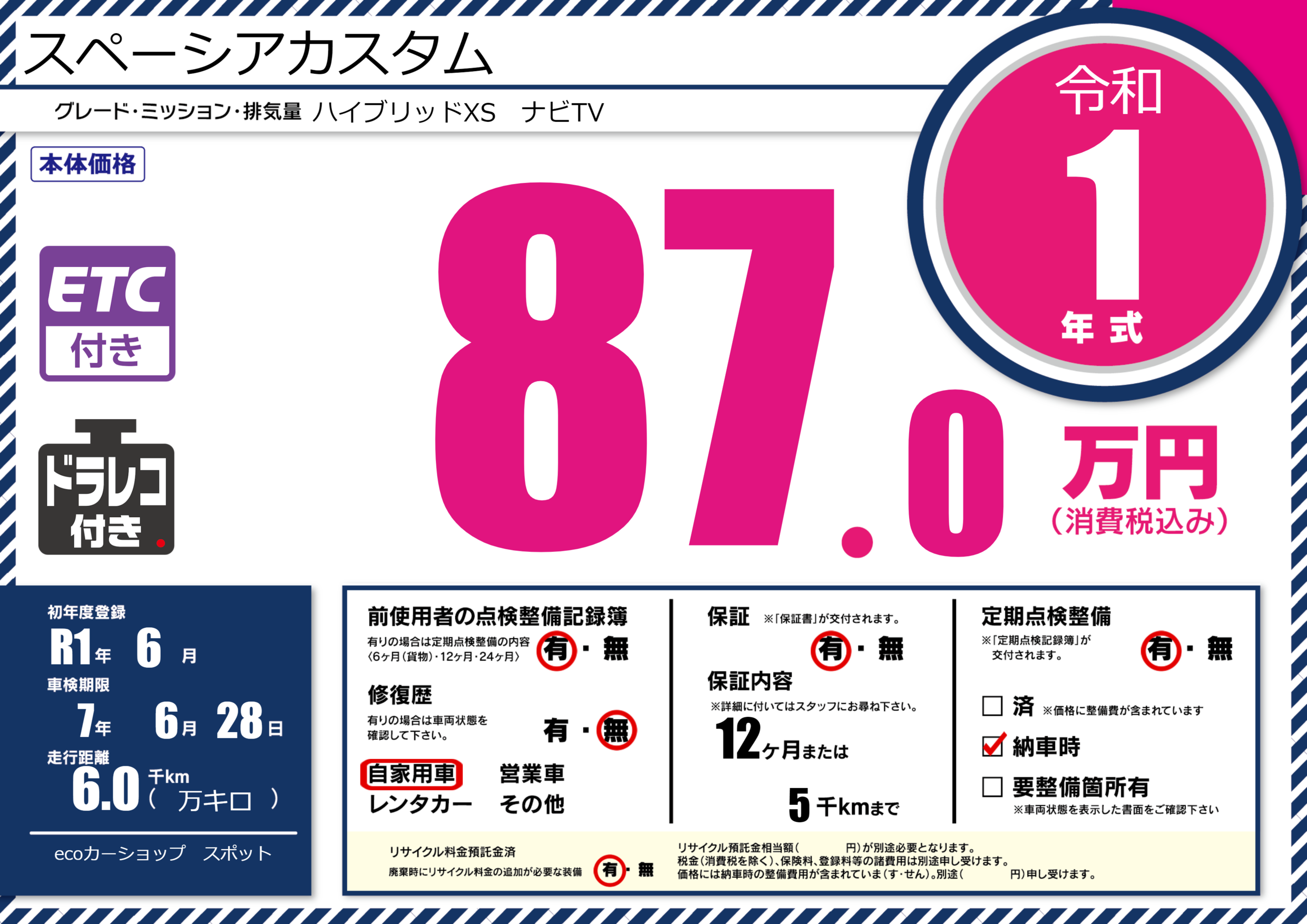 | 車名 | スペーシアカスタム | グレード ミッション 排気量 |