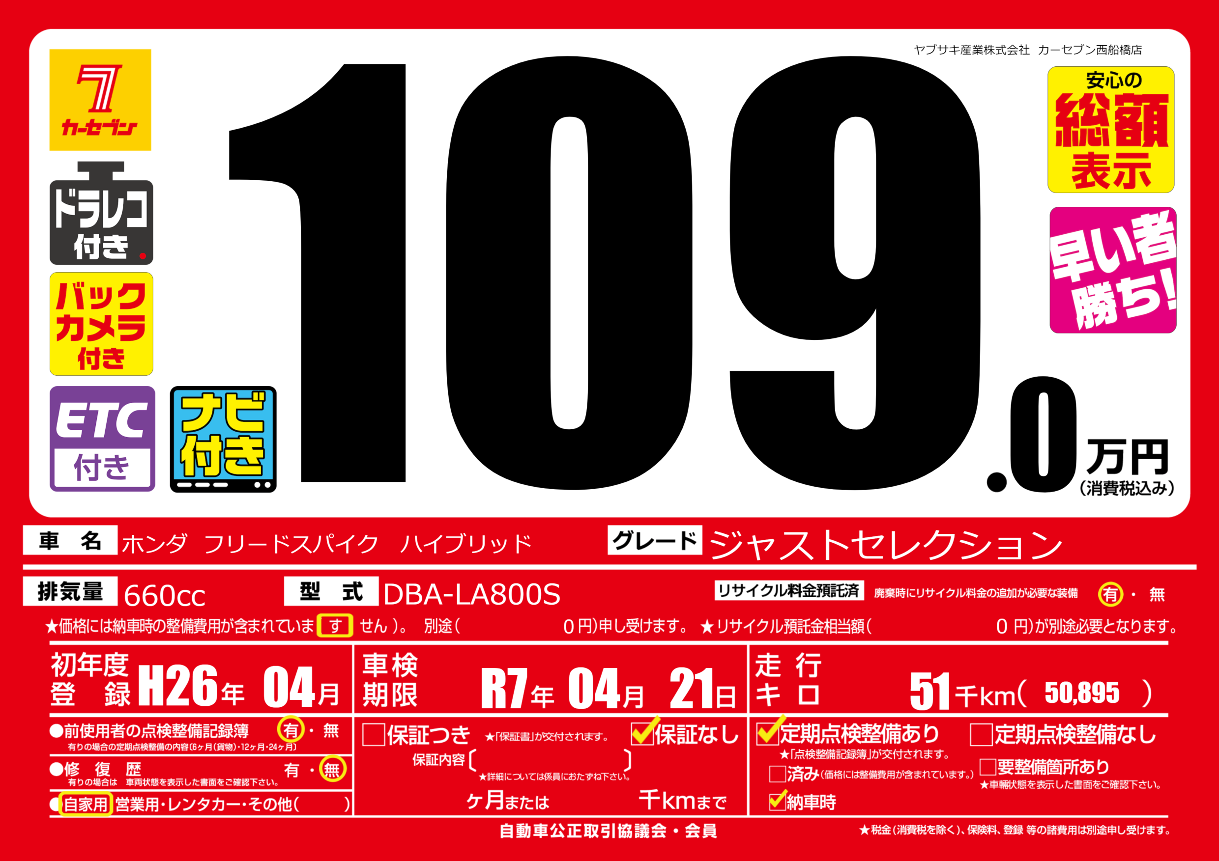 | 走行キロ | 5.1万km | 初年度登録 | H26年04月 |
