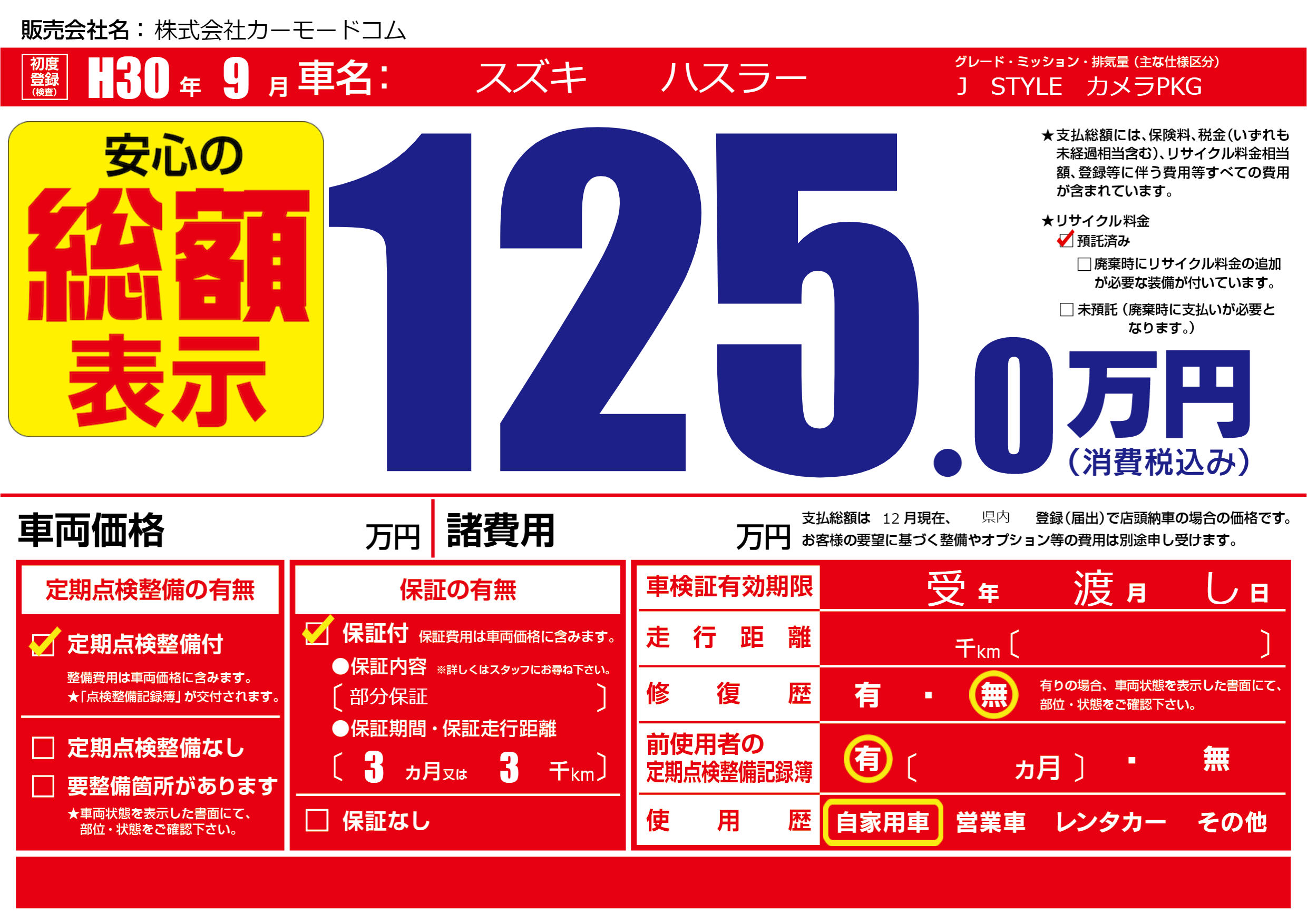 保証付き 保証内容(部分保証) 3ヶ月または(3)千kmまで |
