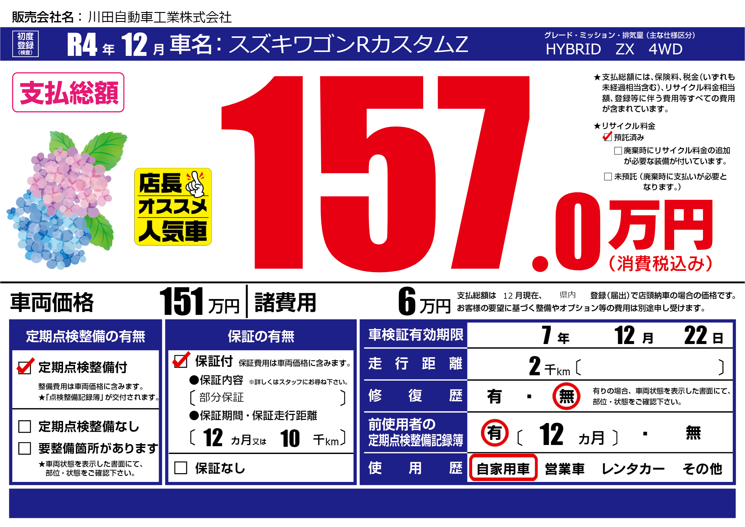 | 走行キロ | 0.2万km | 初年度登録 | R4年12月 |