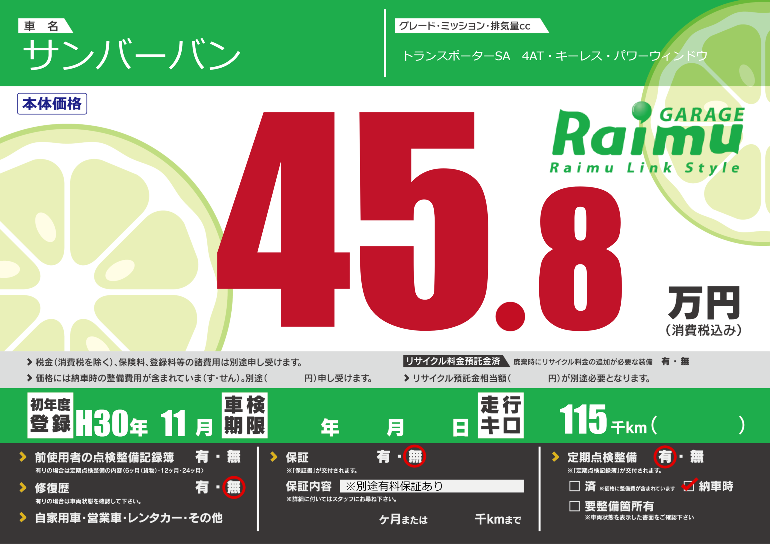 保証なし 保証内容(※別途有料保証あり) ---ヶ月または()千kmまで |