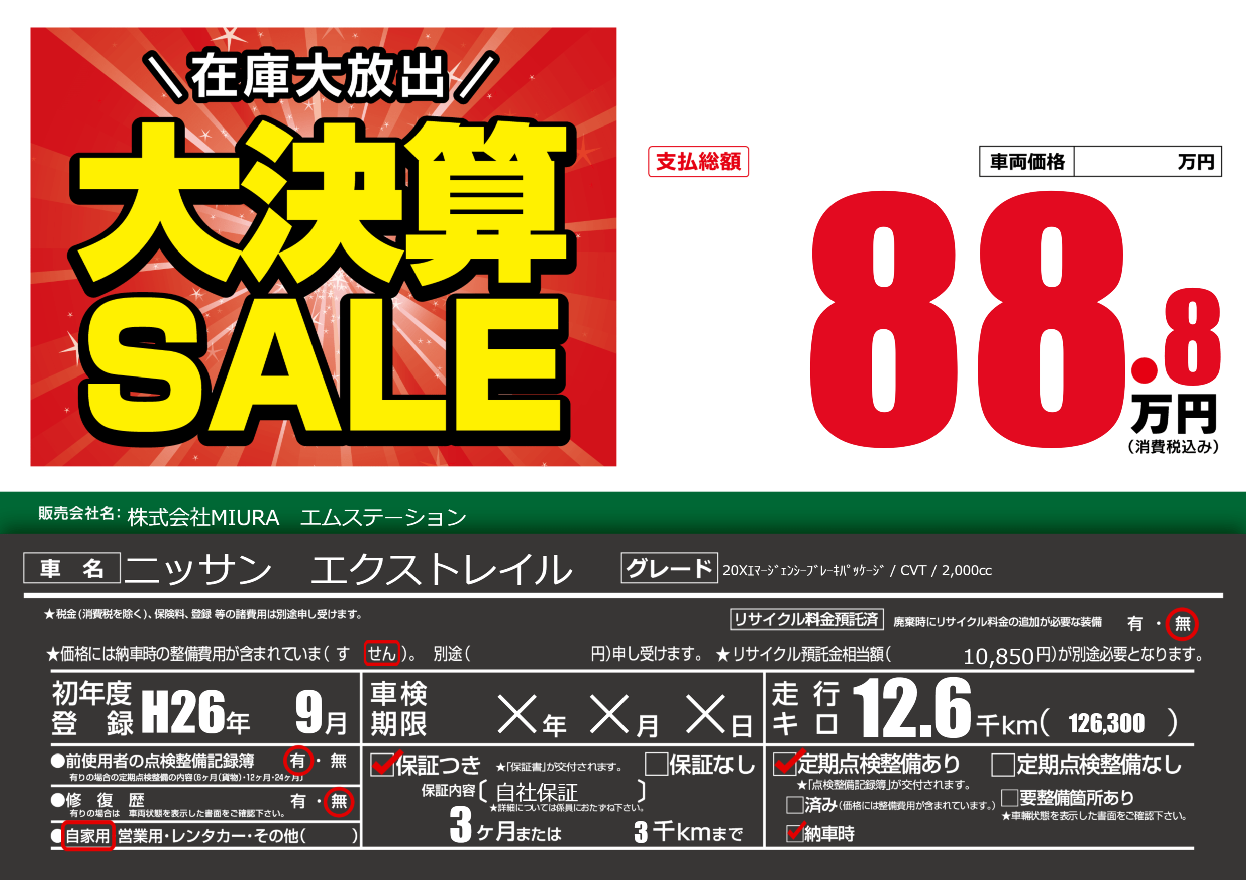 | 車検制限 | ✕年 ✕月 ✕日 | ||
