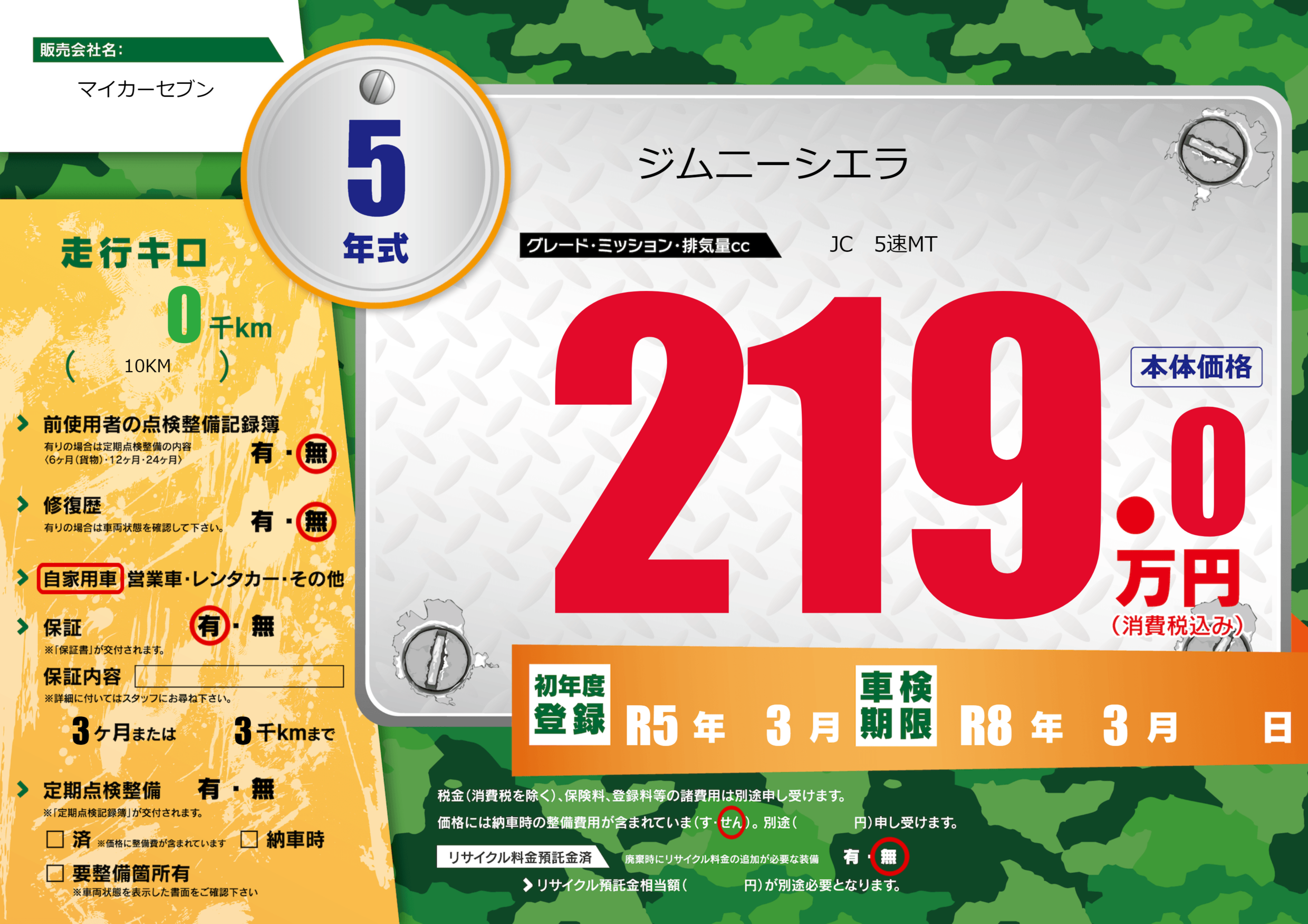 | 車名 | ジムニーシエラ | グレード ミッション 排気量 |