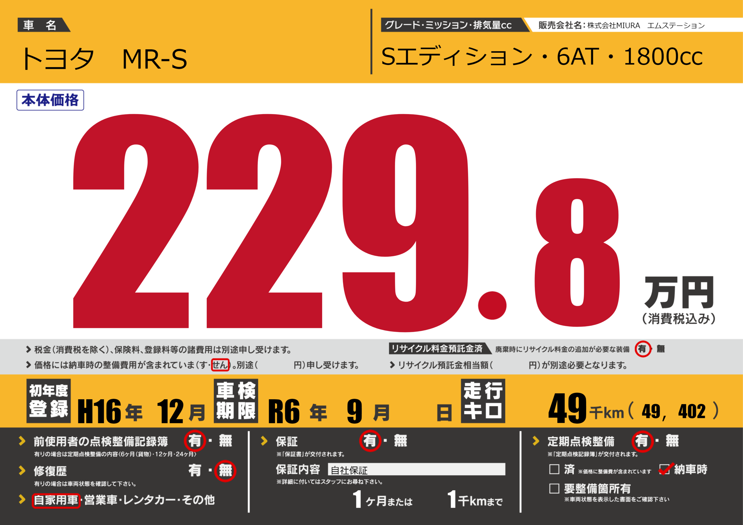 | 車検制限 | R6年 9月 - 日 | ||