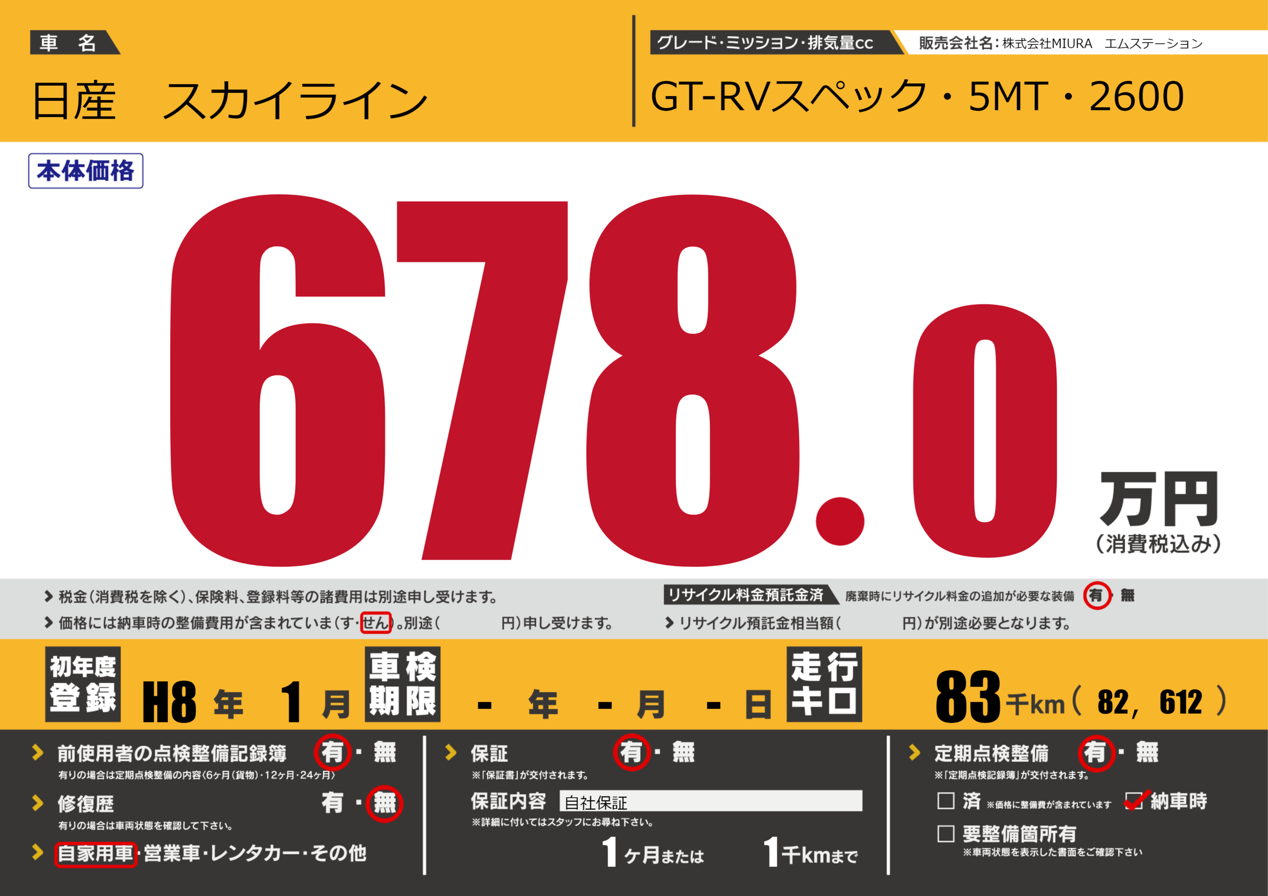 | 車名 | 日産 スカイライン | グレード ミッション 排気量 |