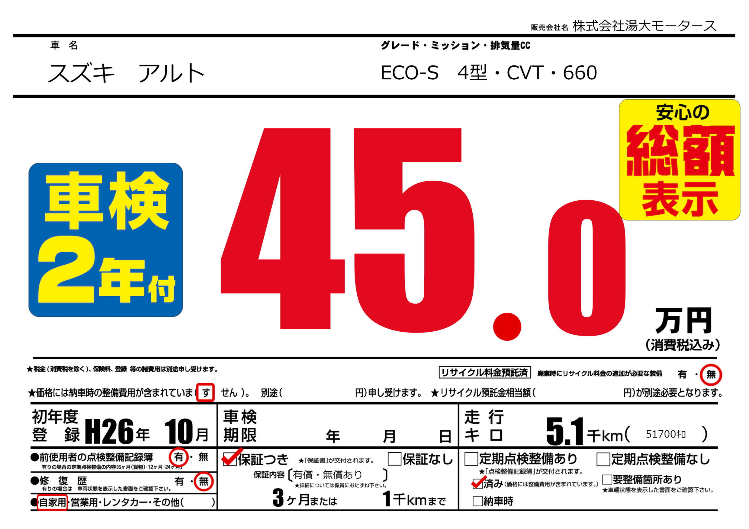 | 車名 | スズキ アルト | グレード ミッション 排気量 |