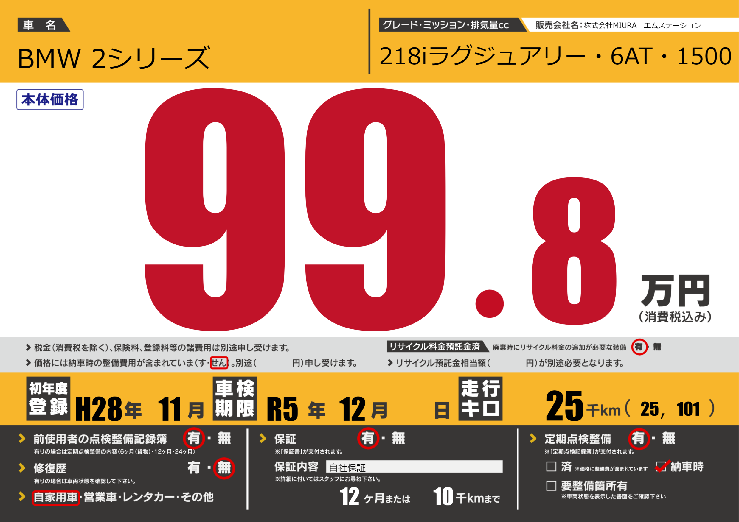 保証付き 保証内容(自社保証) 12ヶ月または10千km |