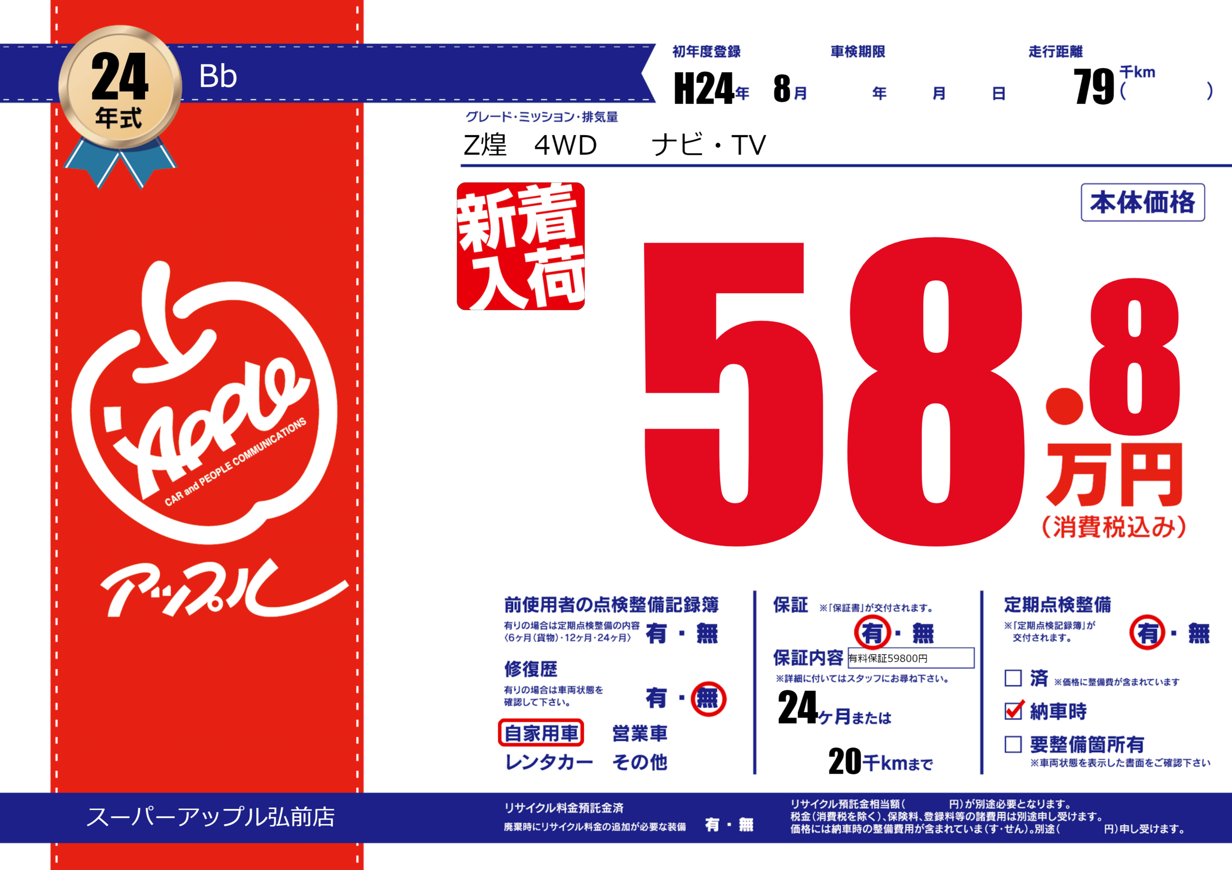 保証付き 保証内容(有料保証59800円) 24ヶ月または(20)千kmまで |