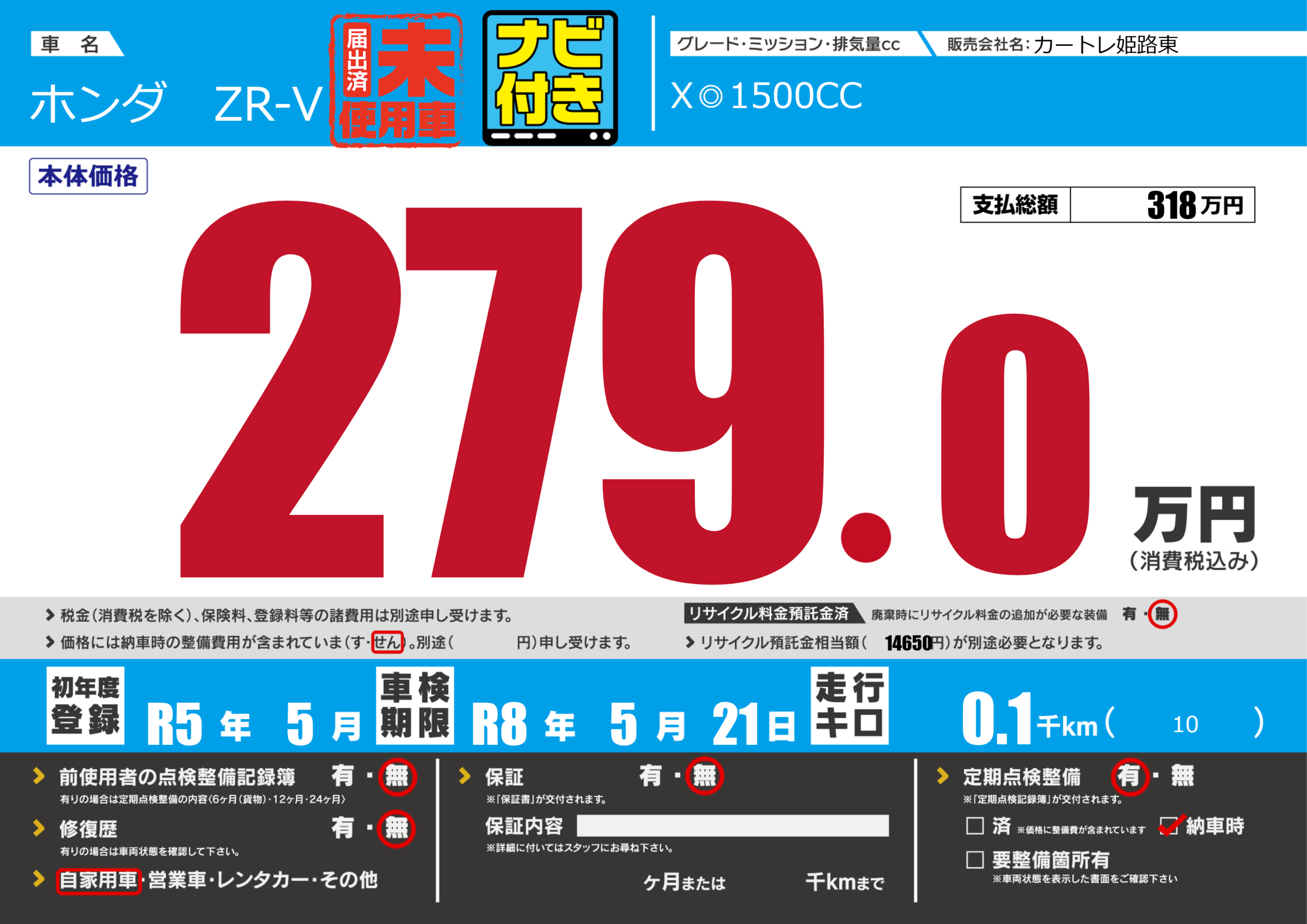 | 車名 | ホンダ ZR-V | グレード ミッション 排気量 |