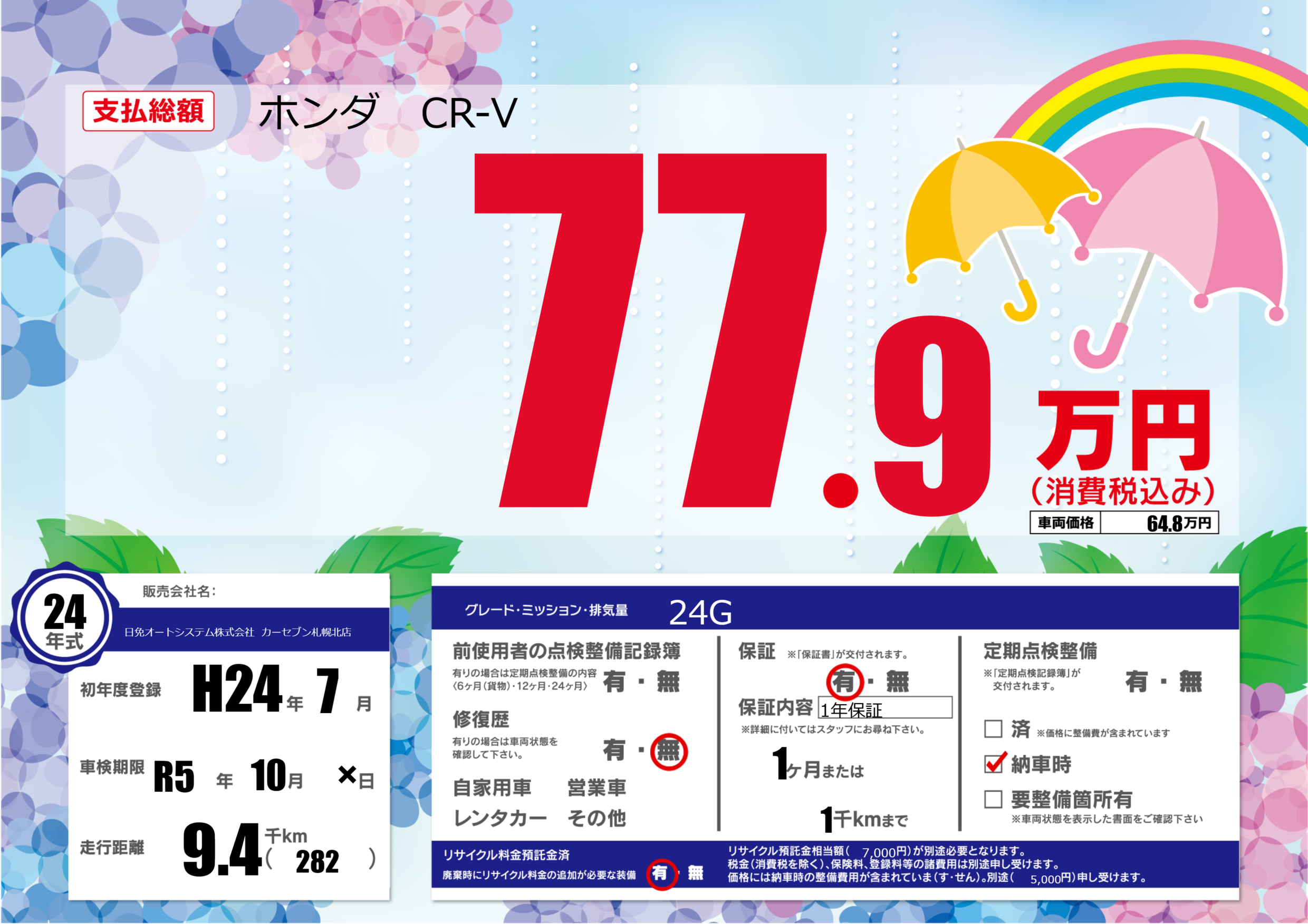 | 車名 | ホンダ CR-V | グレード ミッション 排気量 |
