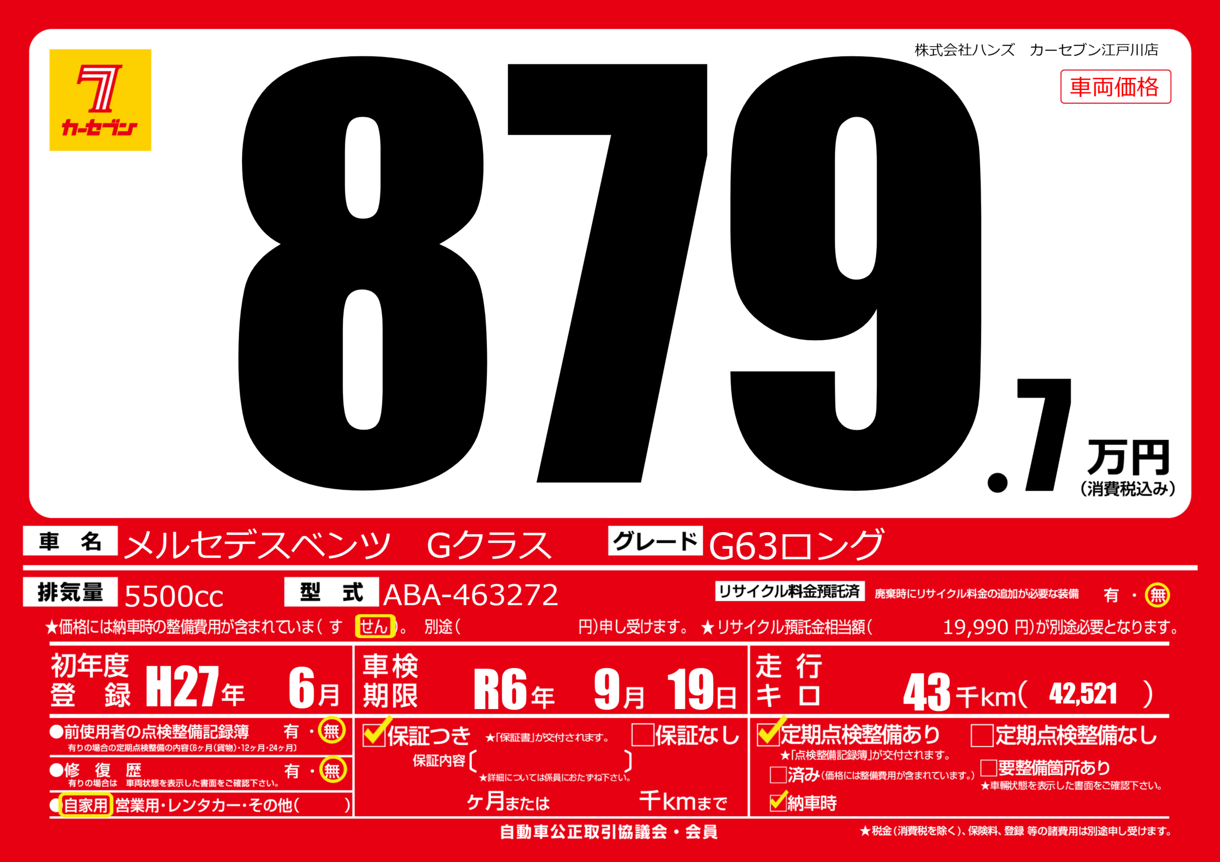 | 車名 | メルセデスベンツ Gクラス | グレード ミッション 排気量 |