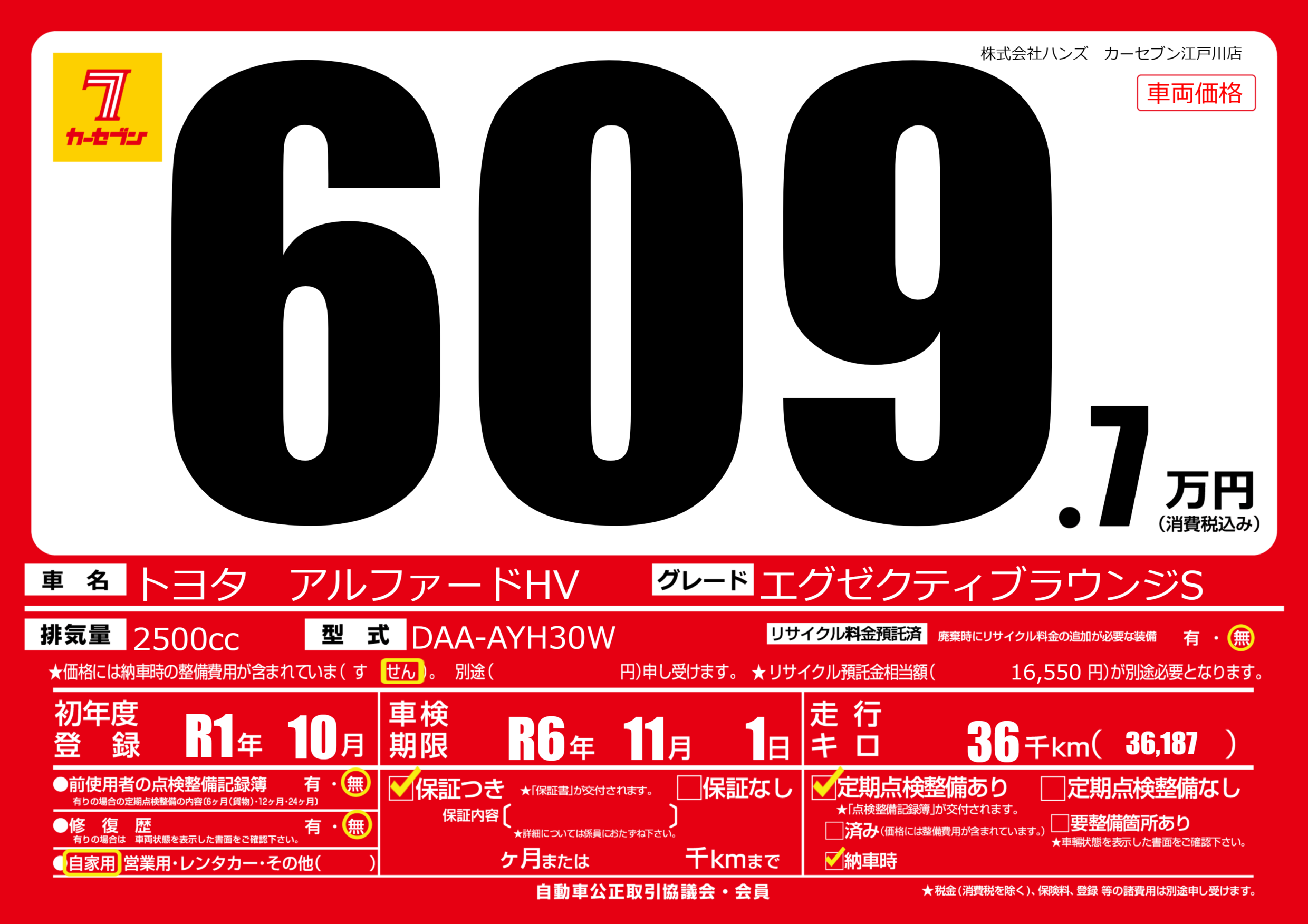 | 車名 | トヨタ アルファードHV | グレード ミッション 排気量 |