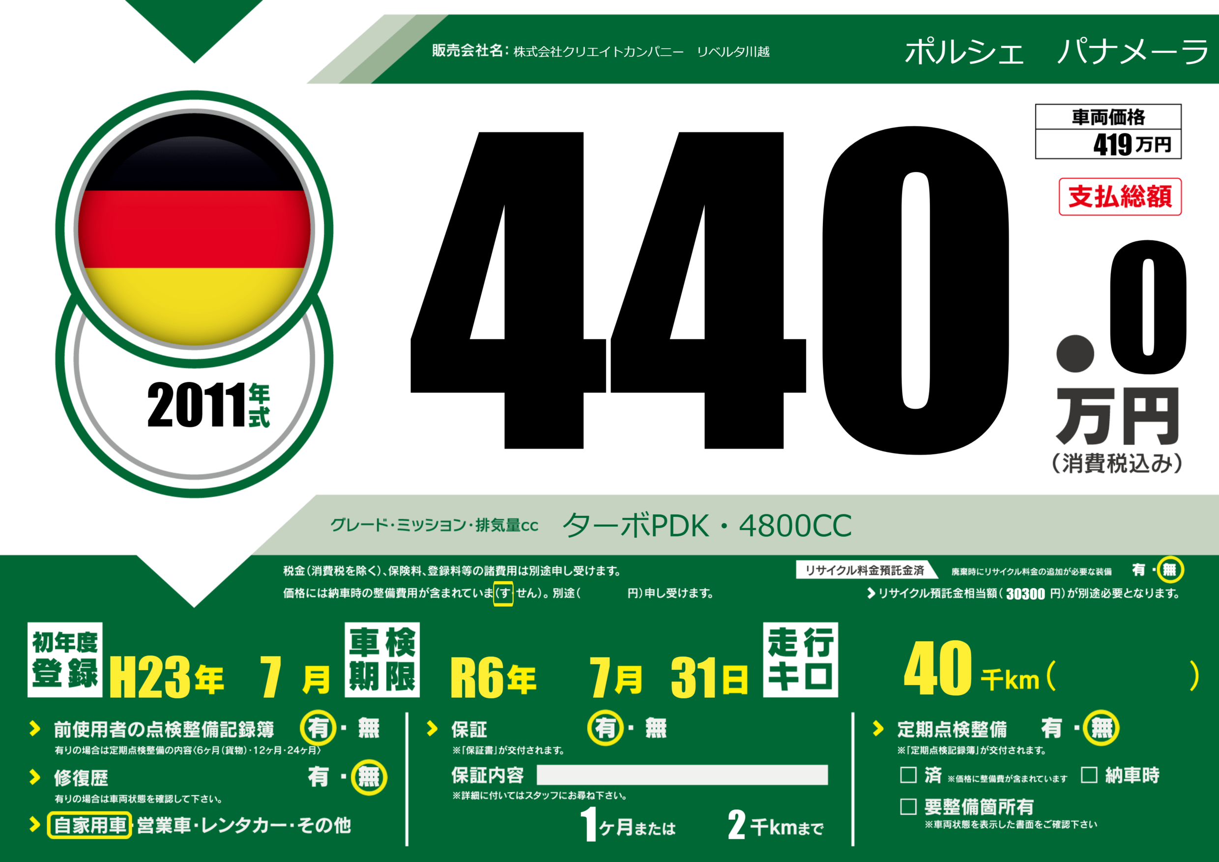 | 車名 | ポルシェ パナメーラ | グレード ミッション 排気量 |