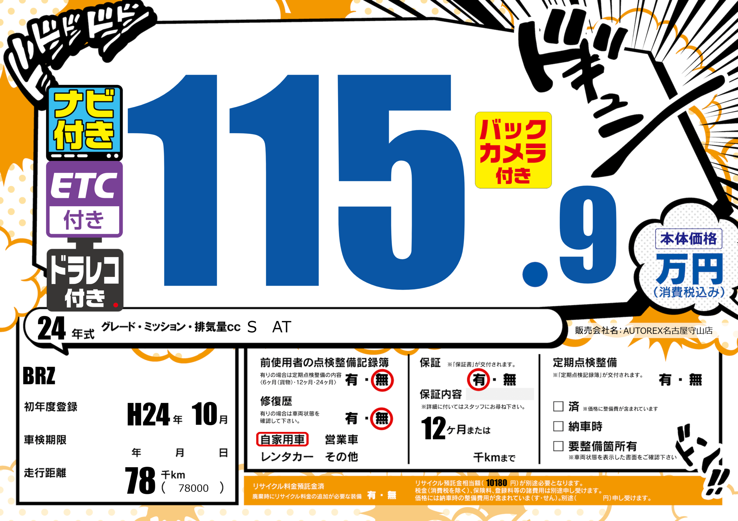 | 車名 | BRZ | グレード ミッション 排気量 |