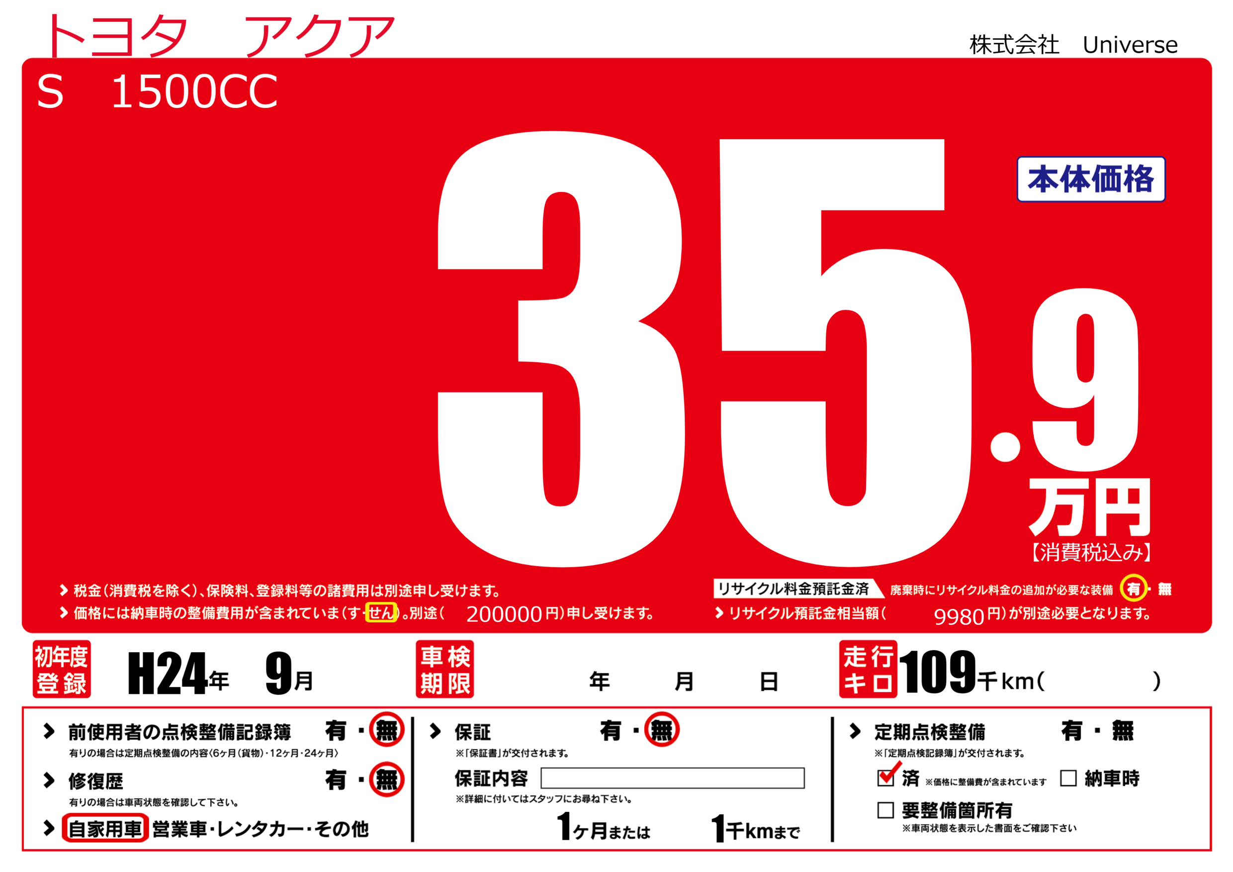| 車名 | トヨタ アクア | グレード ミッション 排気量 |