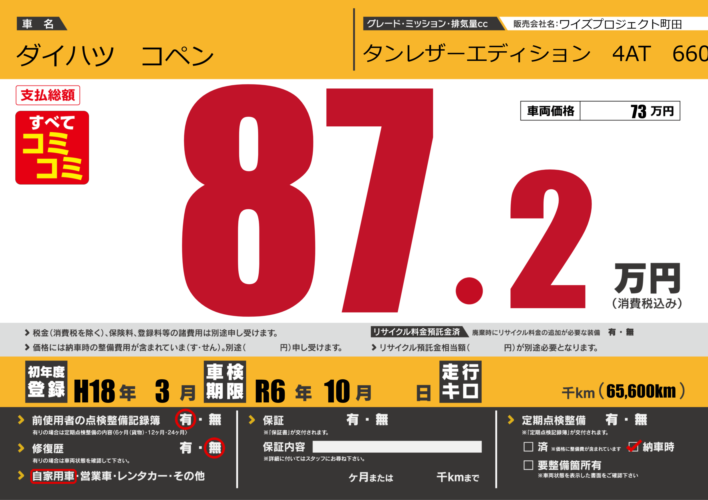 | 車名 | ダイハツ コペン | グレード ミッション 排気量 |
