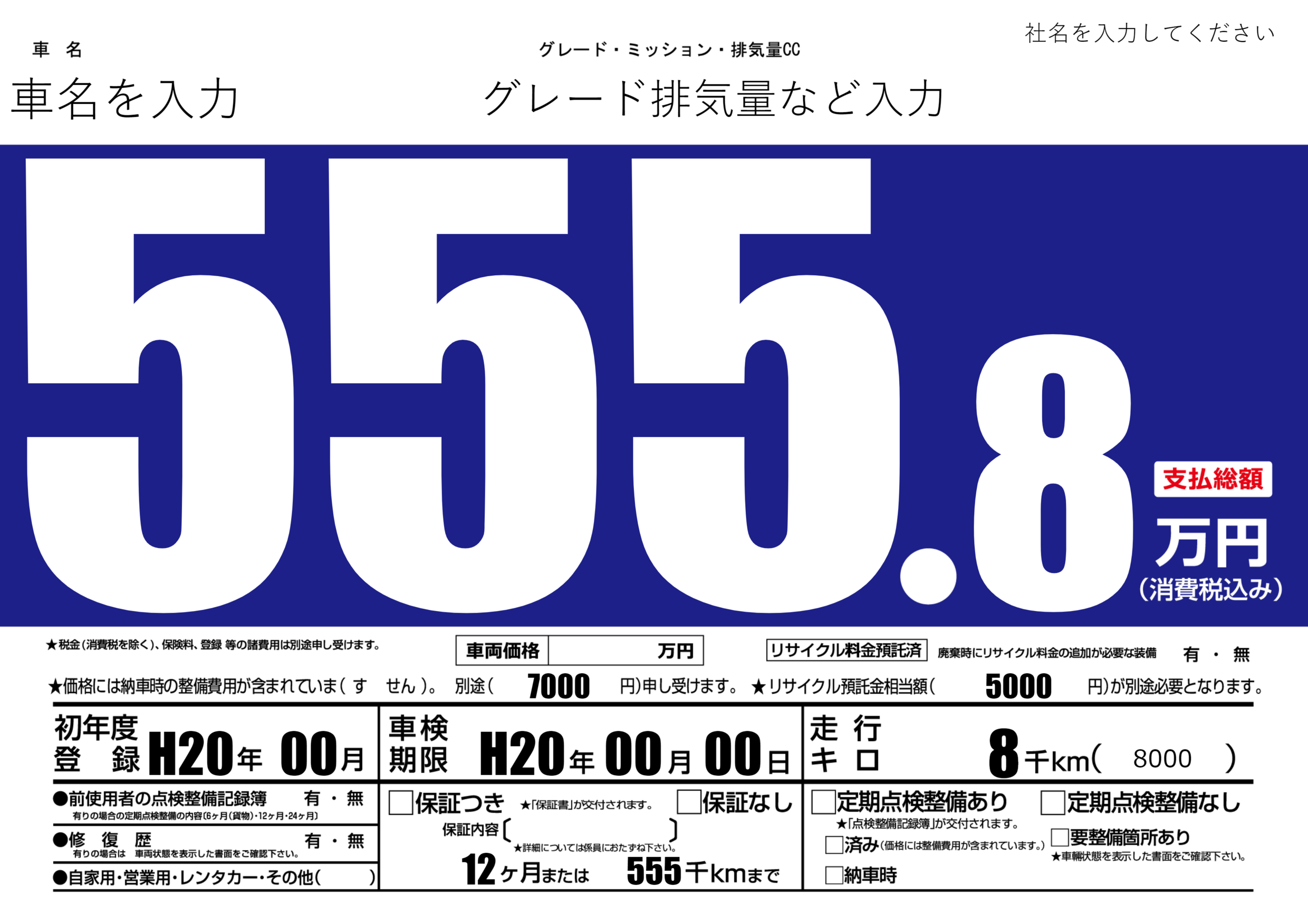 | 車検制限 | H20年 00月 00日 | ||