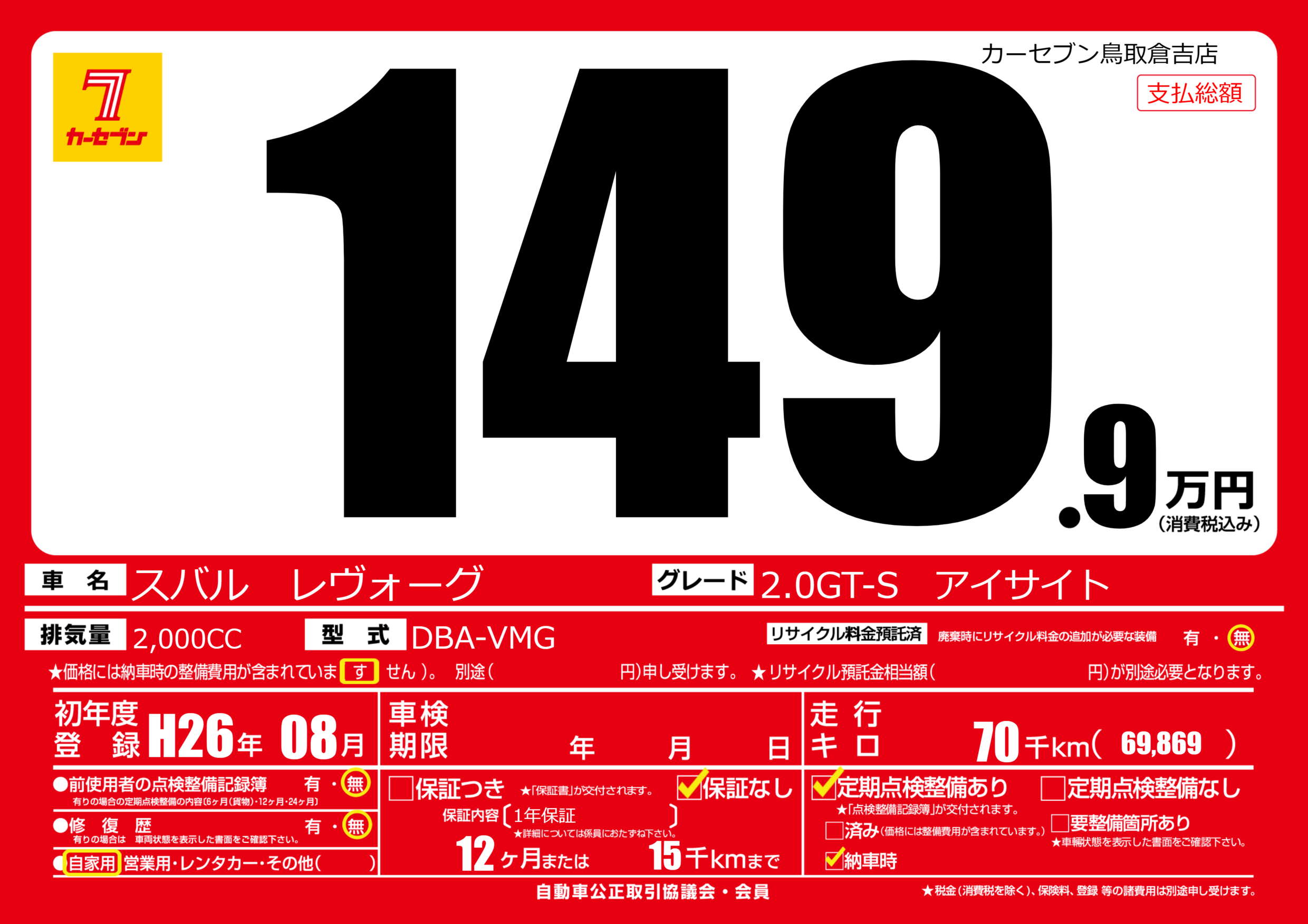 | 車名 | スバル レヴォーグ | グレード ミッション 排気量 |