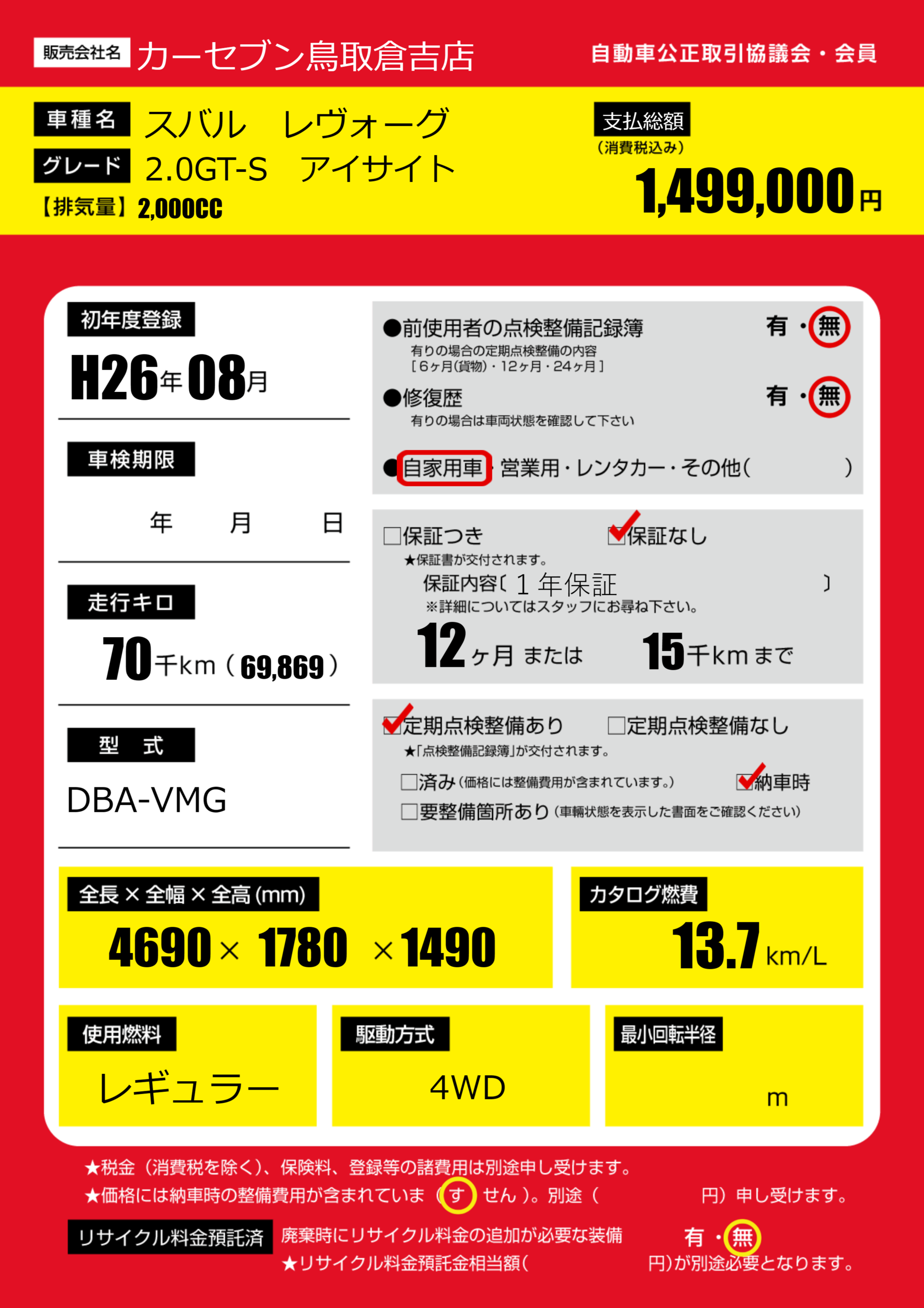 | 車名 | スバル レヴォーグ | グレード ミッション 排気量 |