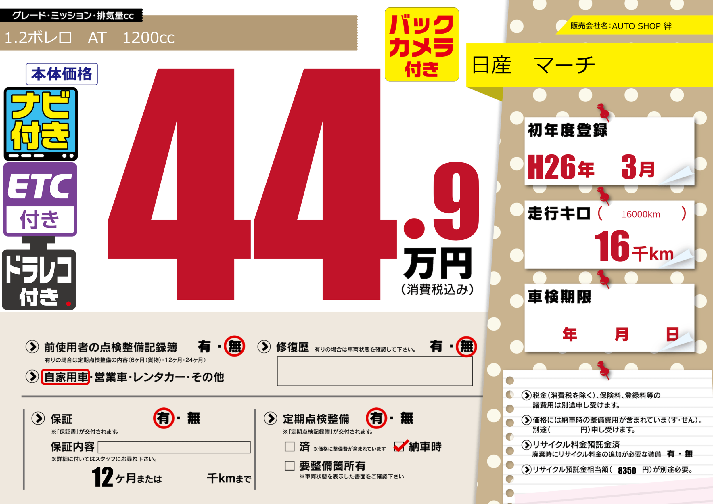 | 車名 | 日産 マーチ | グレード ミッション 排気量 |