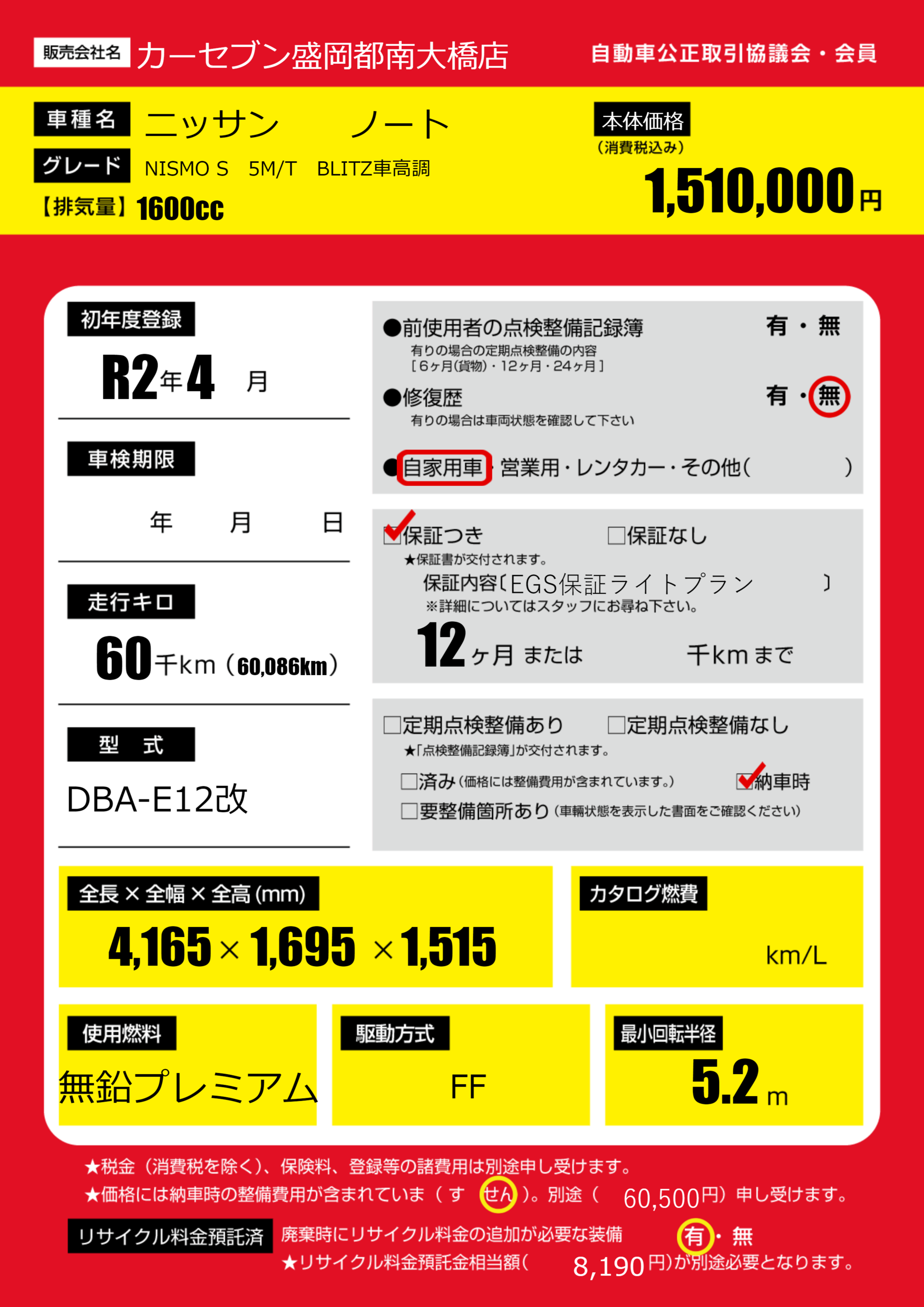 | 車名 | ニッサン ノート | グレード ミッション 排気量 |