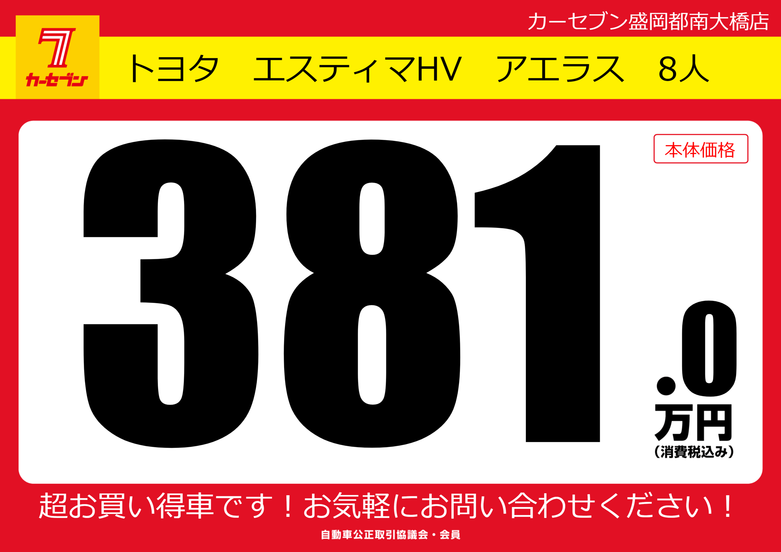 | 車名 | トヨタ エスティマHV アエラス 8人 | グレード ミッション 排気量 |