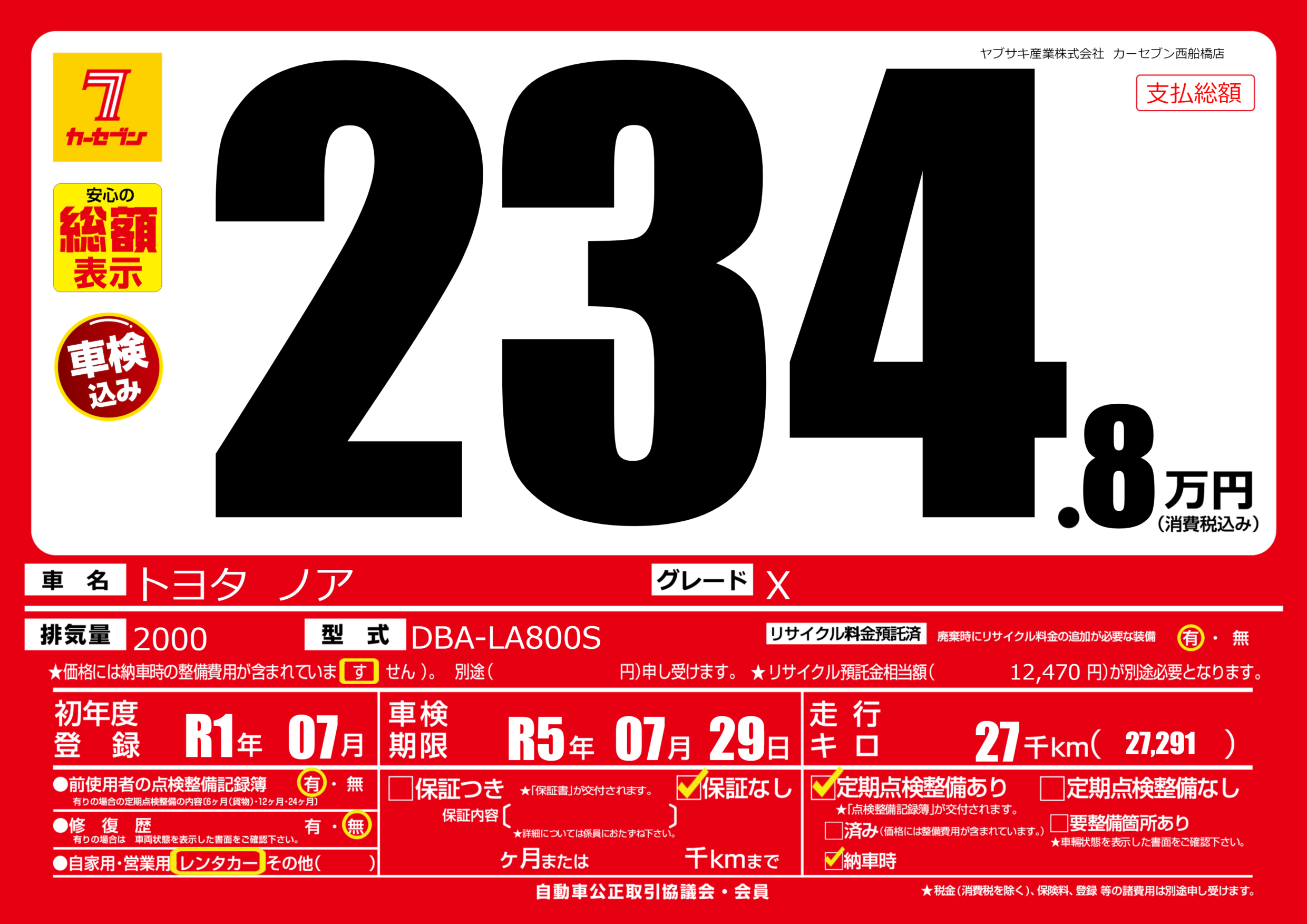 | 走行キロ | 2.7万km | 初年度登録 | R1年07月 |