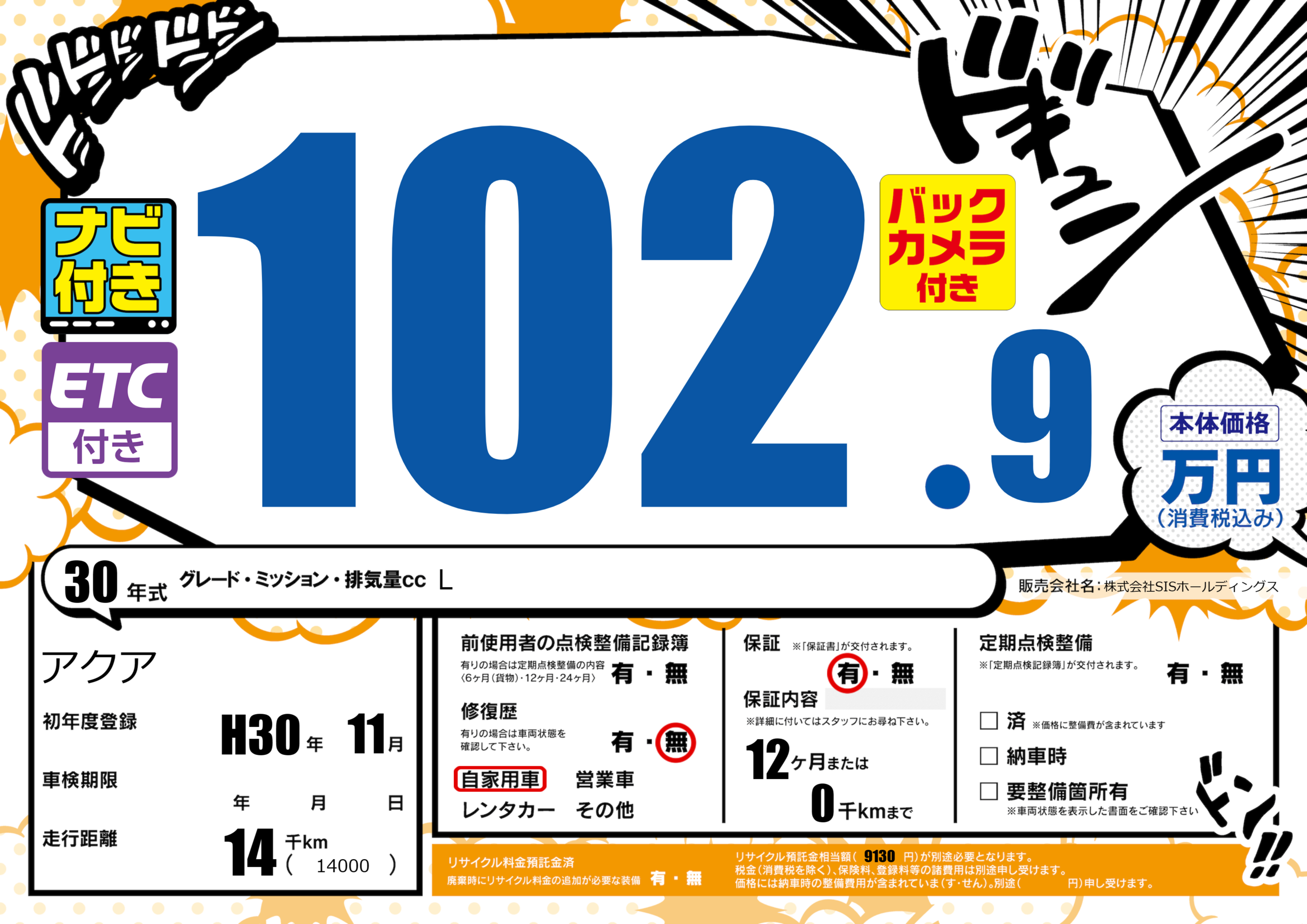 保証付き 保証内容(---) 12ヶ月または(0)千kmまで |