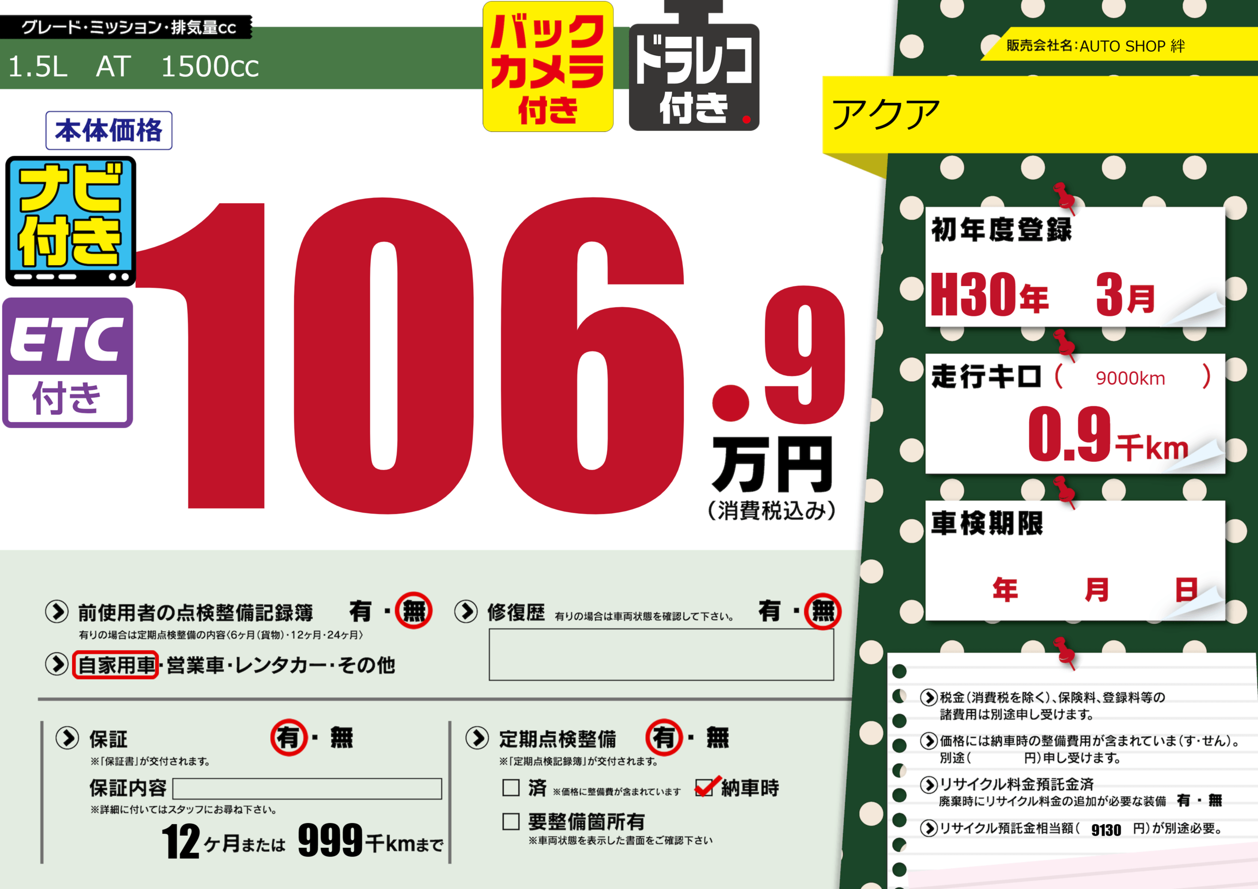 保証付き 保証内容(---) 12ヶ月または(999)千kmまで |