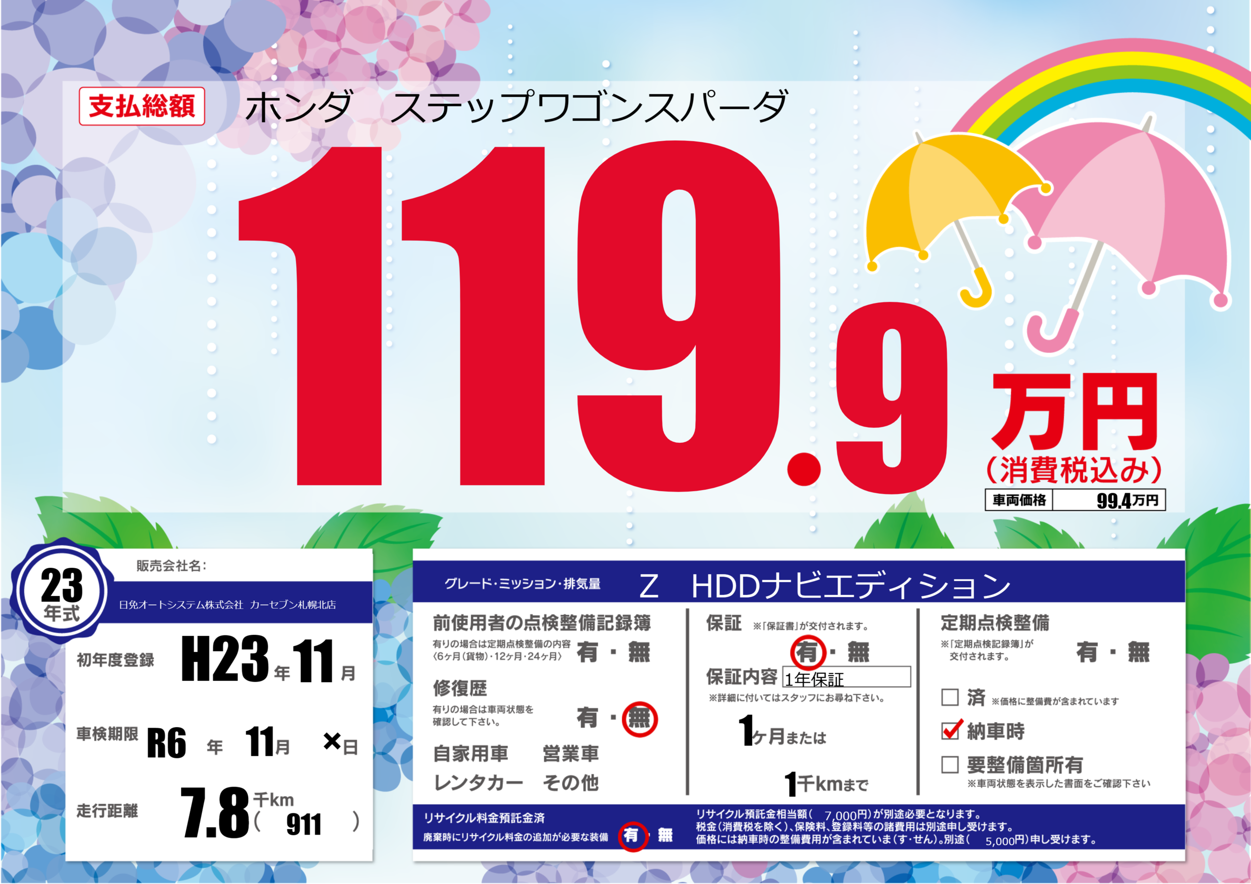 | 走行キロ | 0.7万km | 初年度登録 | H23年11月 |