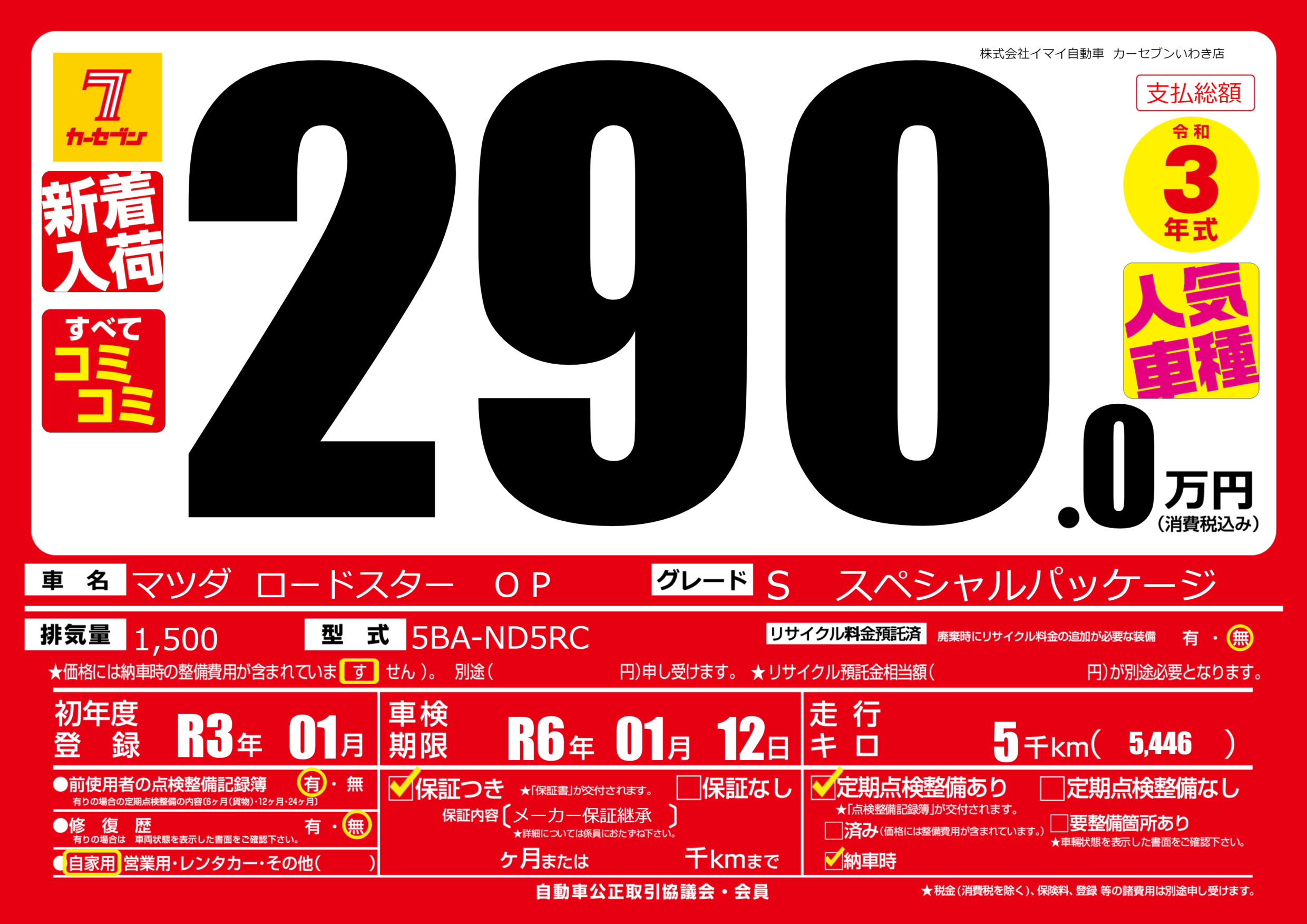 | 車名 | マツダ ロードスター OP | グレード ミッション 排気量 |