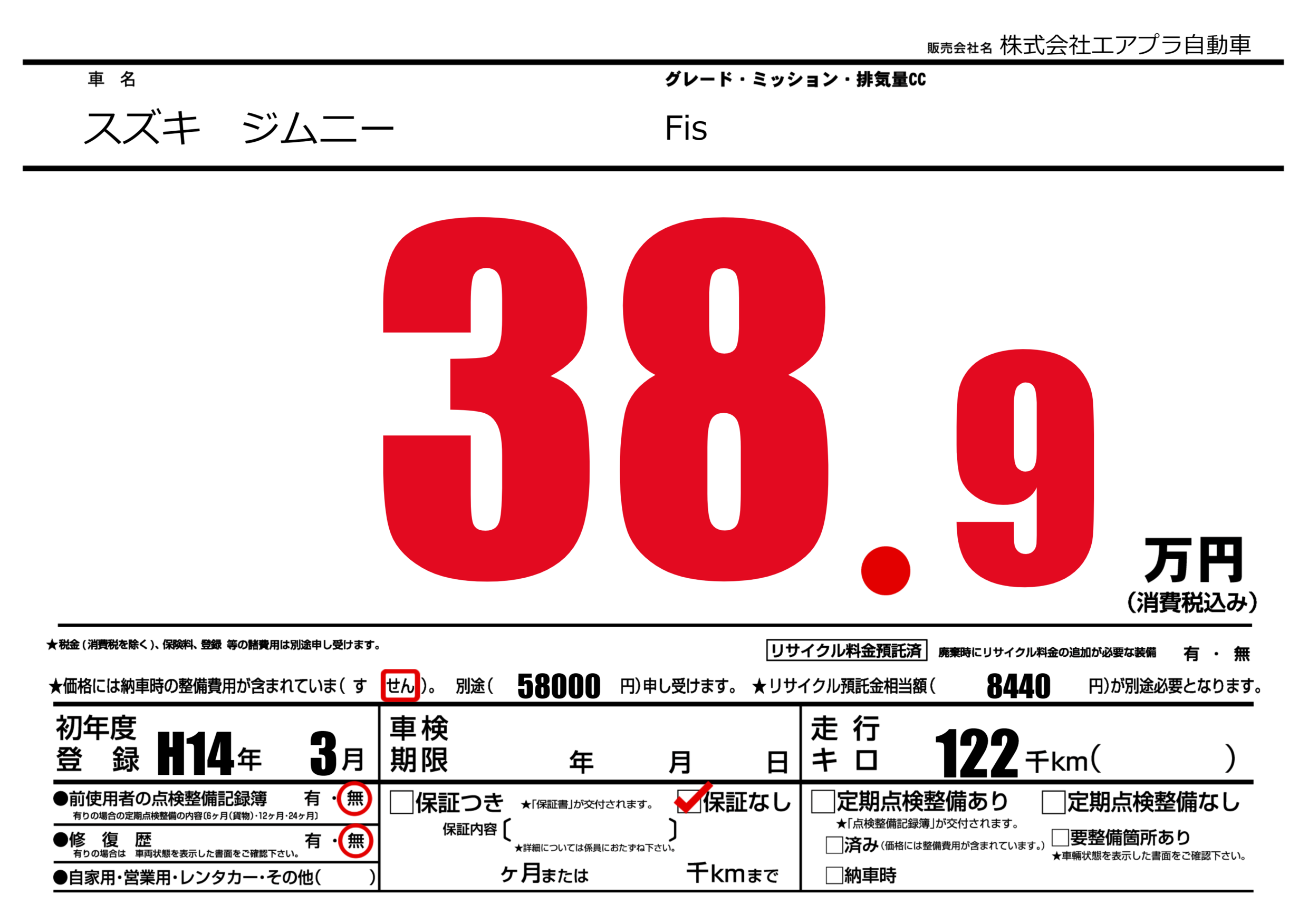| 車名 | スズキ ジムニー | グレード ミッション 排気量 |