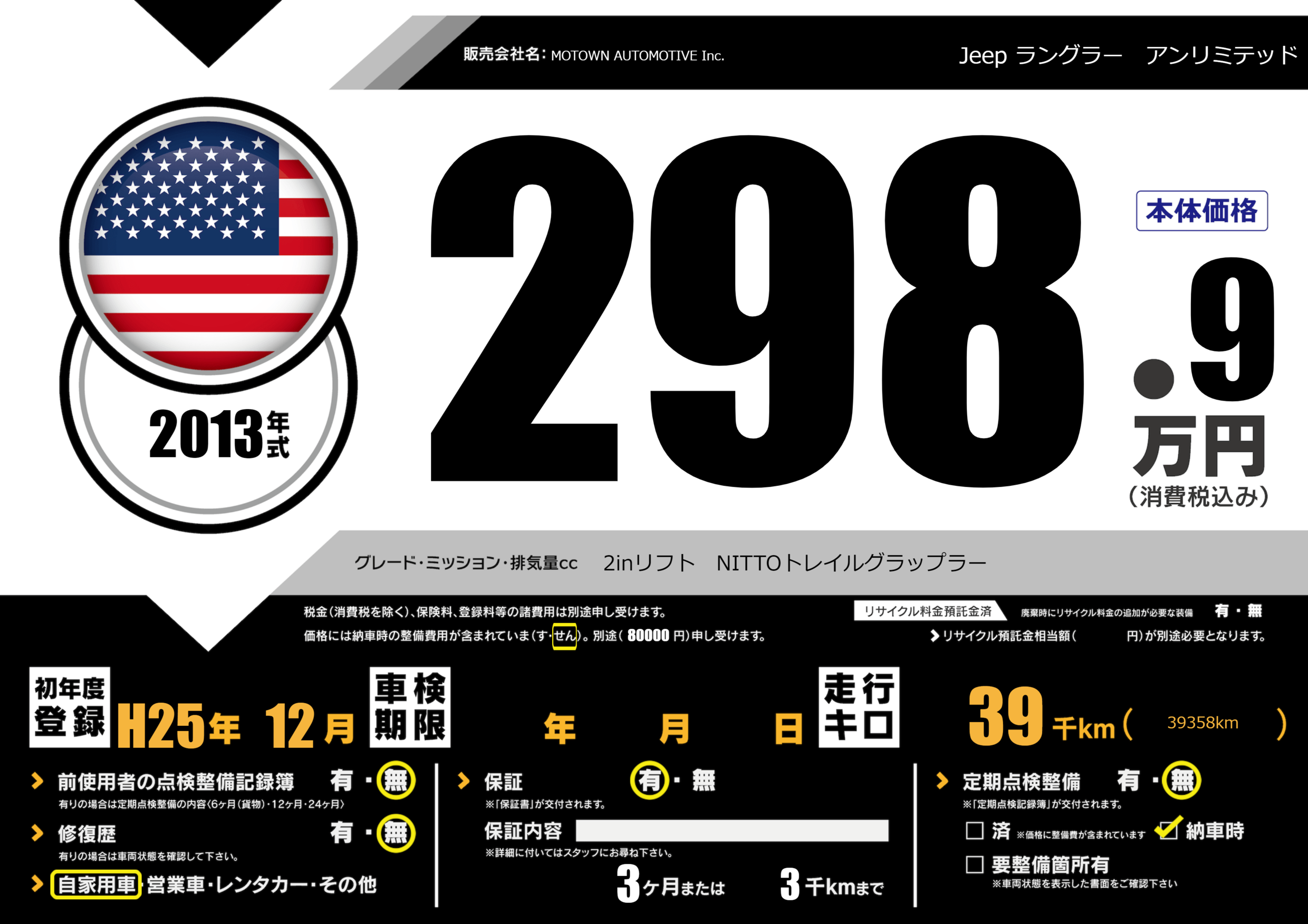 保証付き 保証内容(---) 3ヶ月または(3)千kmまで |