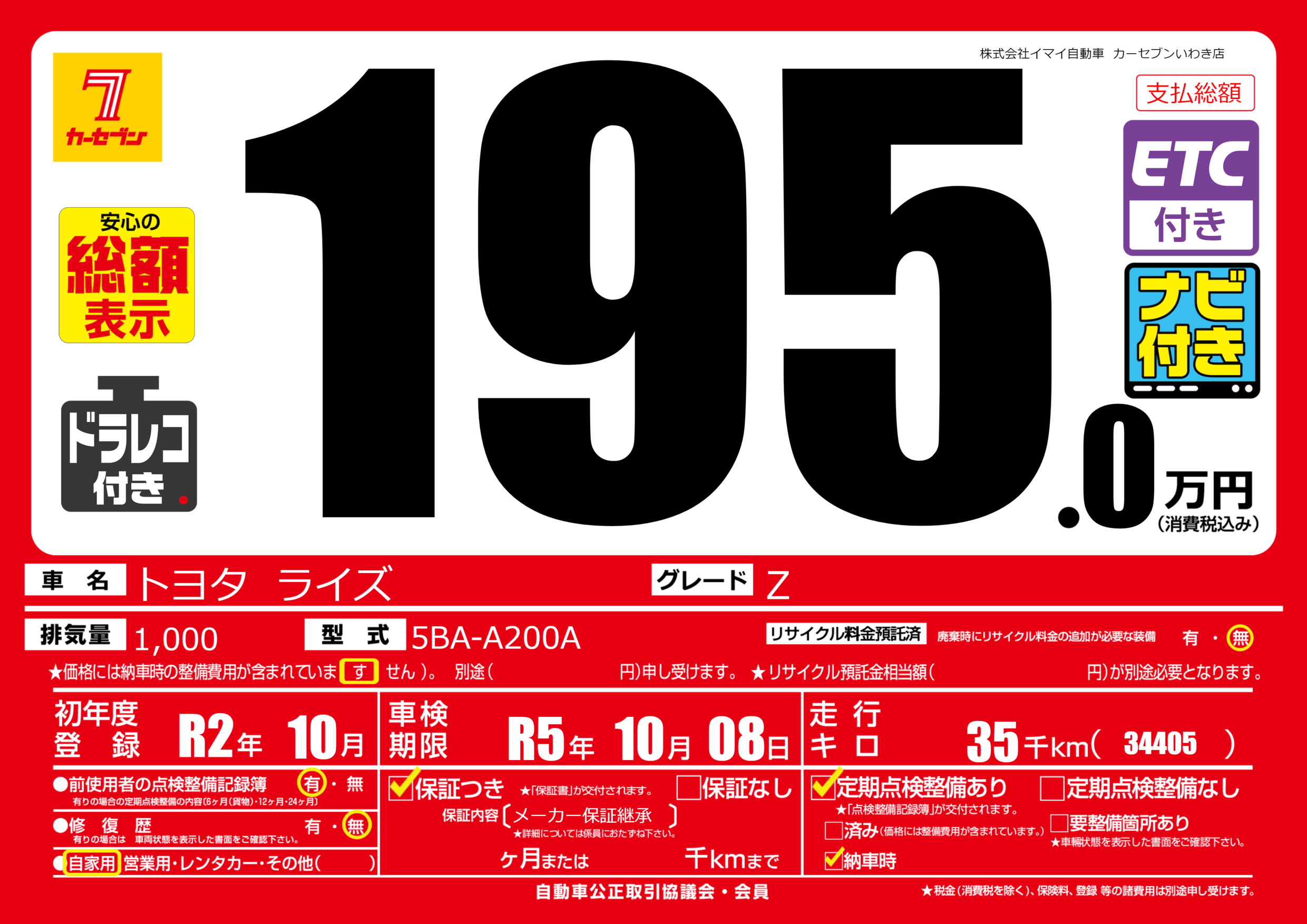 | 車名 | トヨタ ライズ | グレード ミッション 排気量 |