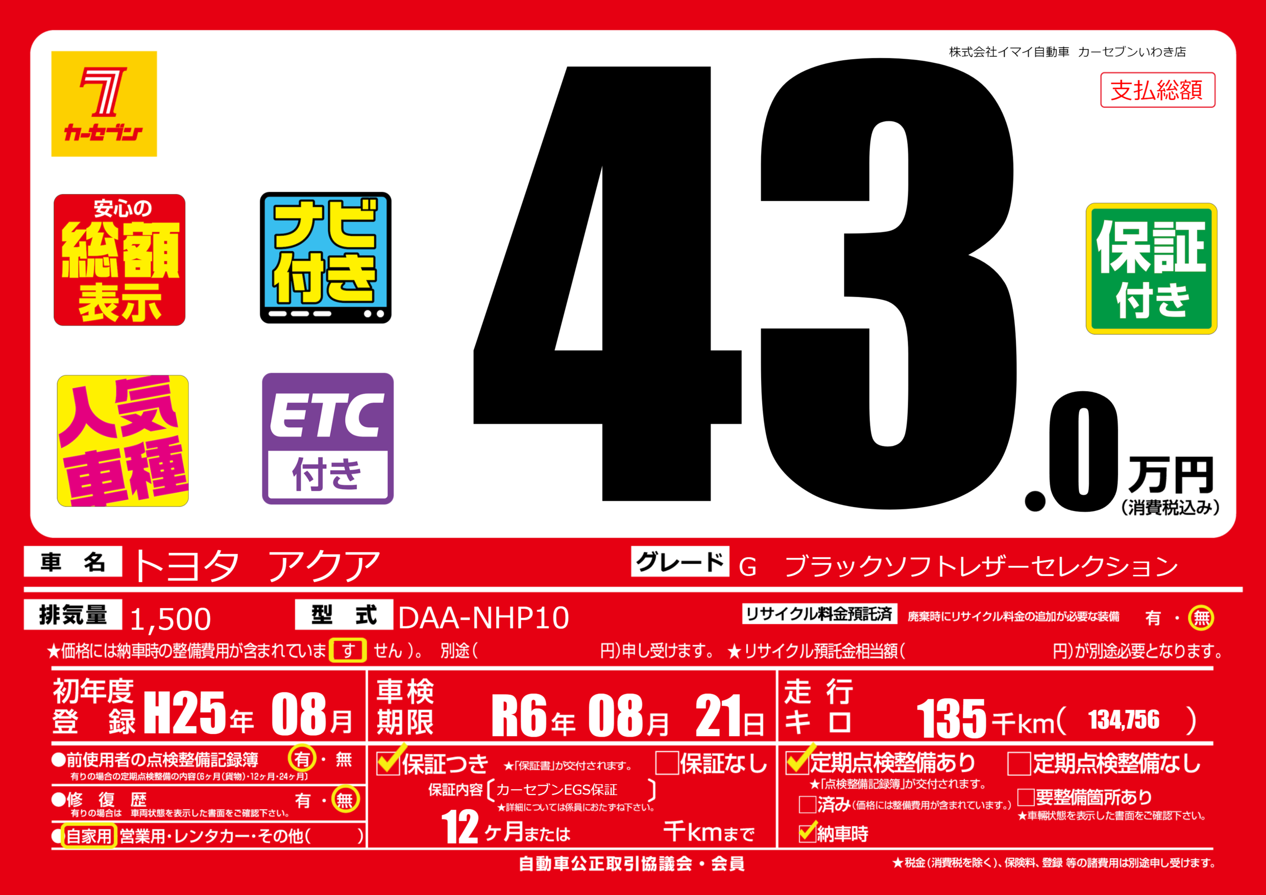 | 車名 | トヨタ アクア | グレード ミッション 排気量 |