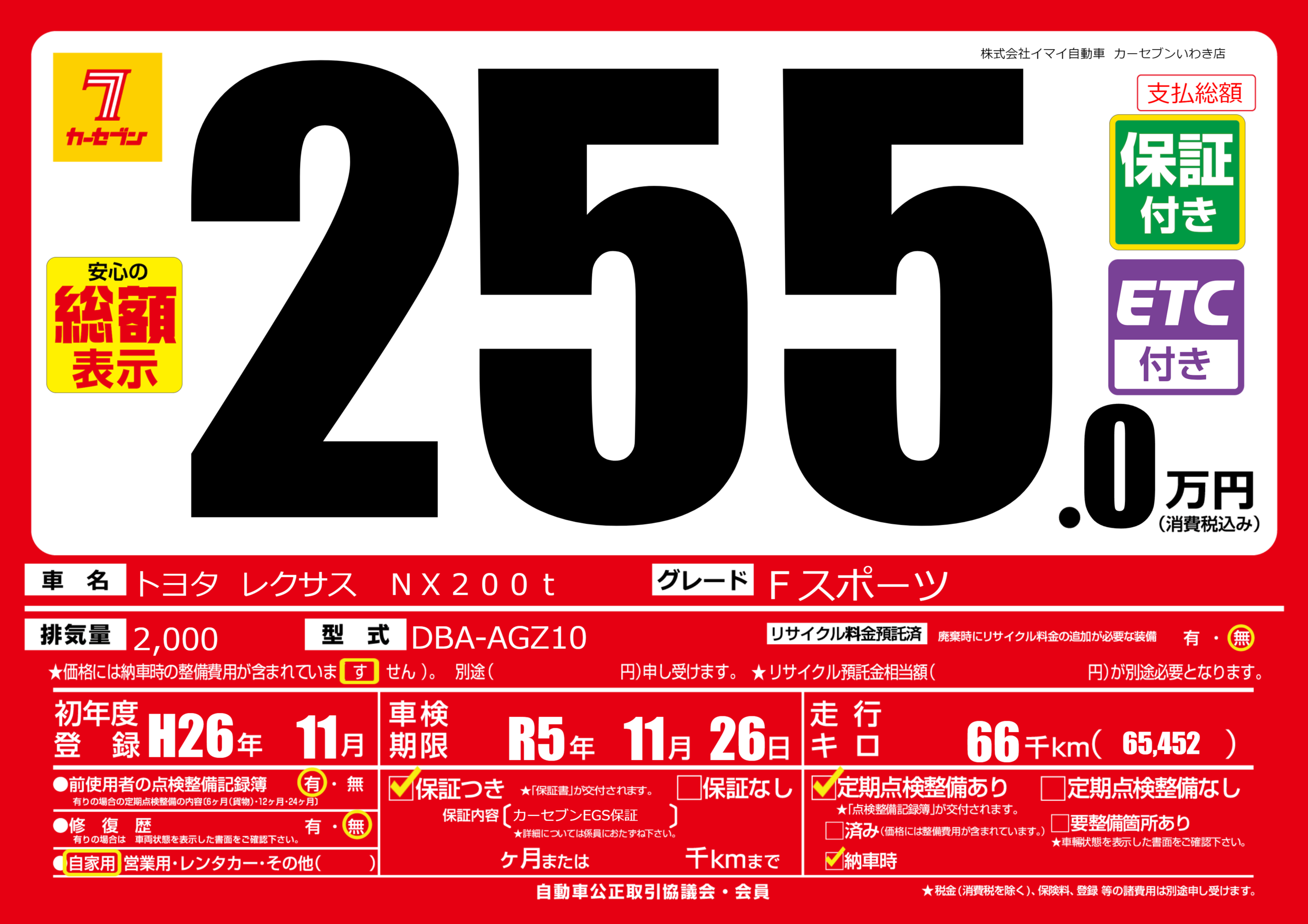 | 車名 | トヨタ レクサス NX200t | グレード ミッション 排気量 |